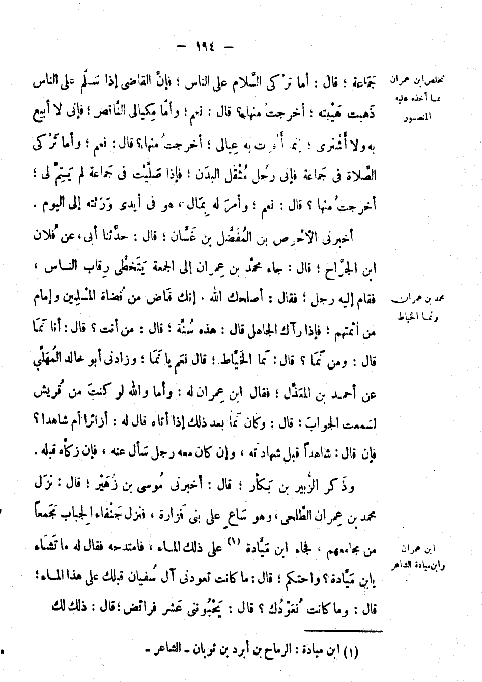أَخْبَرَنِي الأحوص بْن المفضل بْن غسان؛ قال: حَدَّثَنَا أبي، عَن فلان ابن الجراح؛ قال: جاء مُحَمَّدبْن عِمْرَان إِلَى الجمعة يتخطى رقاب الناس، فقام إليه رجل؛ فقال: أصلحك الله، إنك قاض من قضاة المسلمين وإمام من أئمتهم؛ فإذا رآك الجاهل قال: هذه سنة؛ قال: من أنت ? قال: أنا نما قال: ومن نما ? قال: نما الخياط؛ قَالَ: نعم يا نما؛ وزادني أَبُو خالد المهلبي عَن أَحْمَد بْن المعذل؛ فَقَالَ: ابن عِمْرَان له: وأما والله لو كنت من قريش لسمعت الجواب؛ قال: وكان نما بعد ذلك إِذَا أتاه قَالَ لَهُ: أزائراً أم شاهداً ? فإن قال: شاهداً قبل شهادته، وإن كان معه رجل سأل عنه، فإن زكاه قبله.