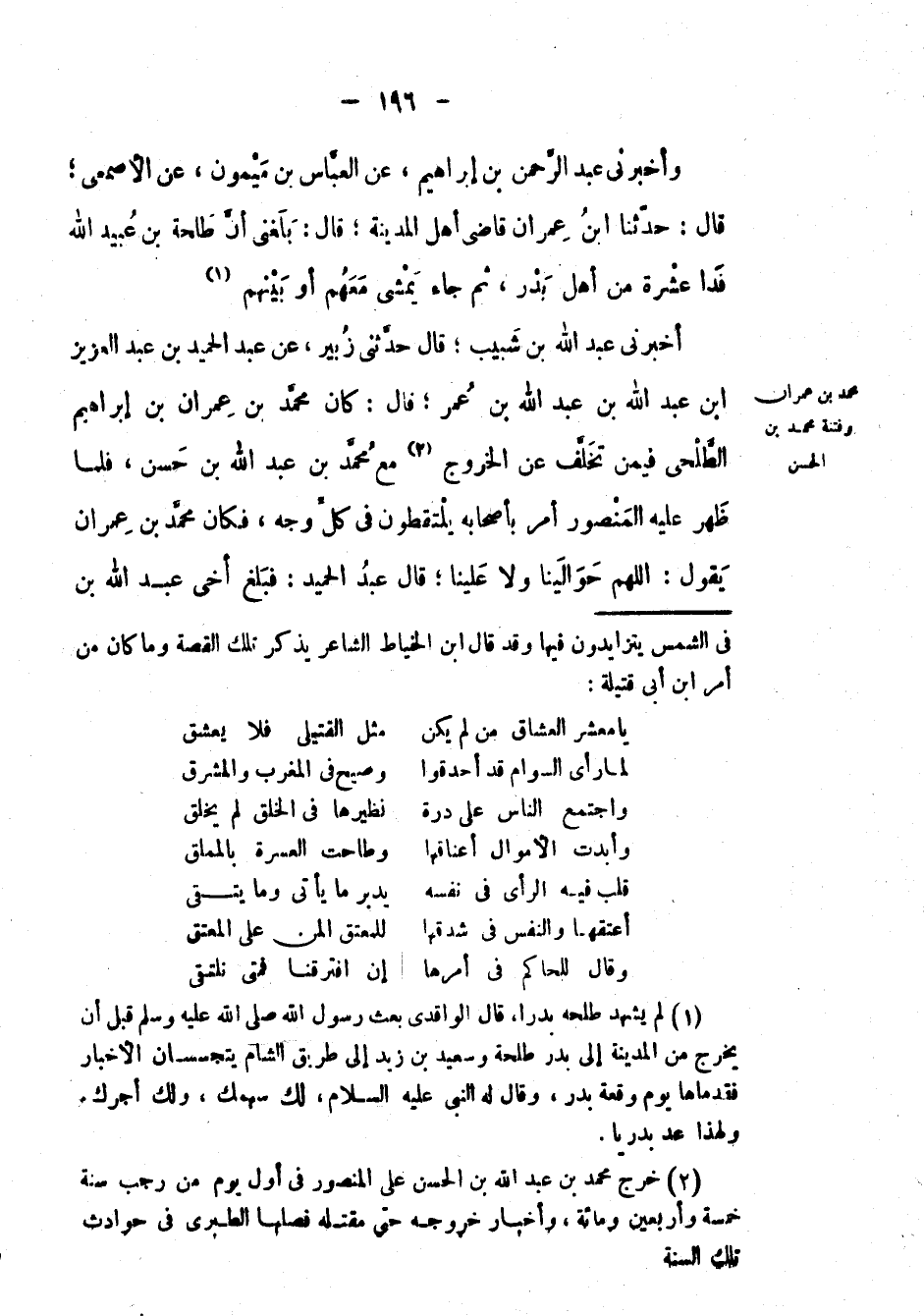 وأَخْبَرَنِي عَبْد الرحمن بْن إبراهيم، عَن العباس بْن ميمون، عَن الأصمعي؛ قال: حَدَّثَنَا ابن عِمْرَان قاضي أهل المدينة؛ قال: بلغني أن طلحة بْن عبيد الله فدا عشرة من أهل بدر، ثم جاء يمشي معهم أو بينهم.