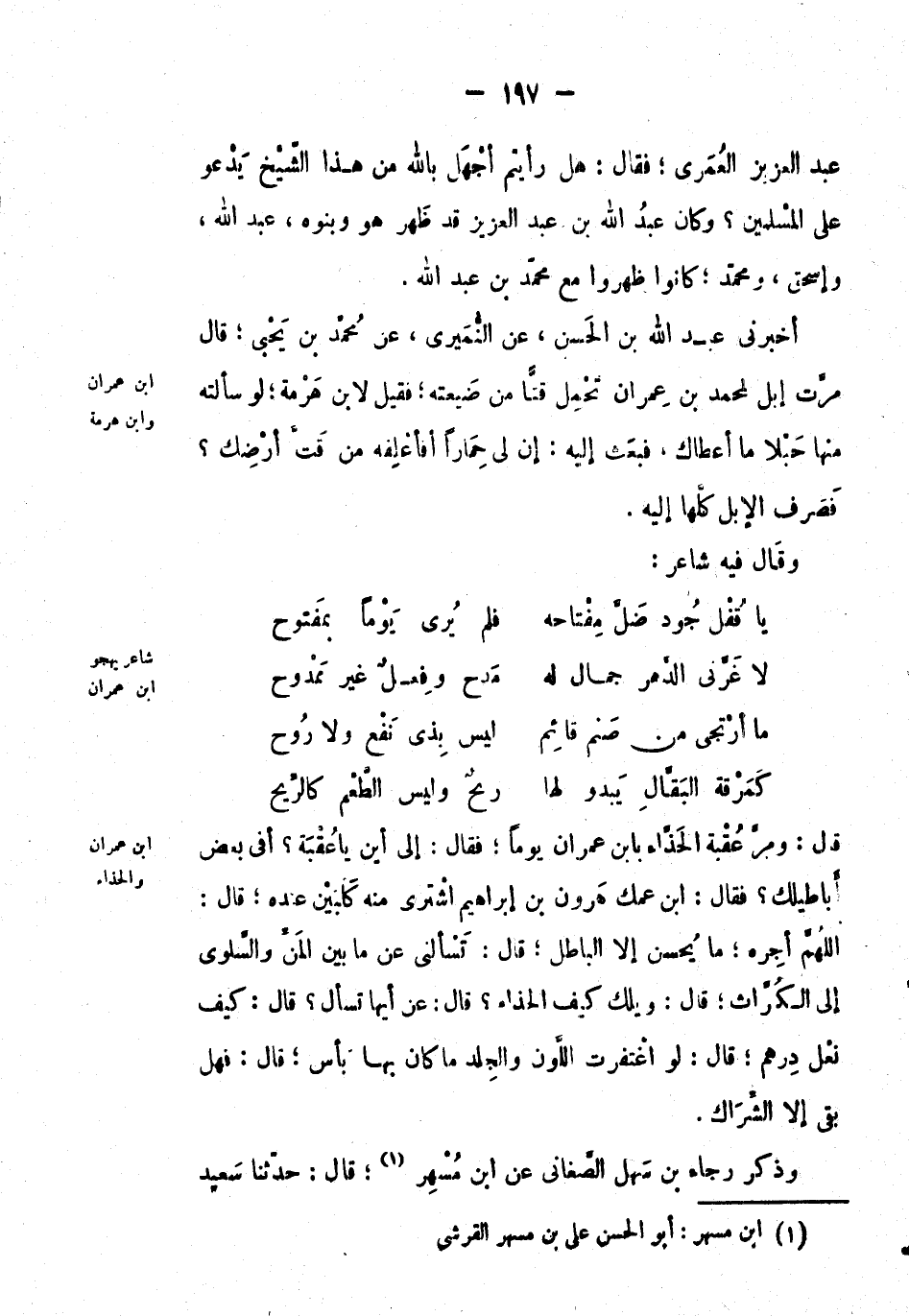 قال: ومر عقبة الحذاء بابن عِمْرَان يوماً؛ فقال: إِلَى أين يا عقبة ? أفي بعض أباطيلك ? فقال: ابن عمك هارون بْن إبراهيم اشترى منه كلبين عنده؛ قال: اللهم أجره؛ ما يحسن إِلَّا الباطل؛ قال: تسألني عَن ما بين المن والسلوى إِلَى الكراث؛ قال: ويلك كيف الحذاء ? قال: عَن أيها تسأل ? قال: كيف نعل درهم؛ قال: لو اغتفرت اللون والجلد ما كان بها بأس؛ قال: فهل بقي إِلَّا الشراك.