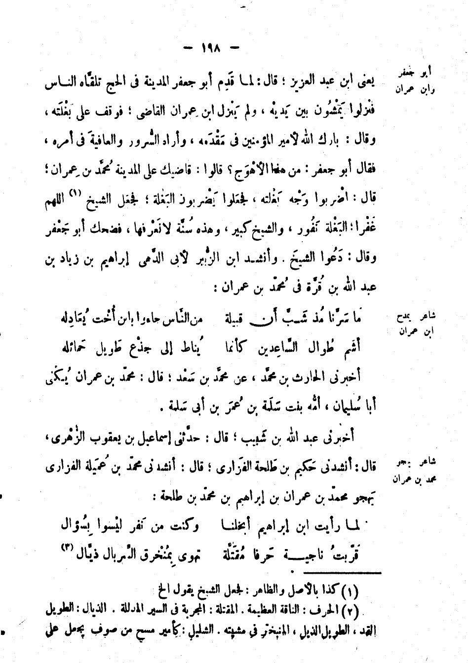 يعني ابن عَبْد العزيز؛ قال: لما قدم أَبُو جعفر المدينة في الحج تلقاه الناس فنزلوا يمشون بين يديه، ولم ينزل ابن عِمْرَان القاضي؛ فوقف على بغلته، وقال: بارك الله لأمير المؤمنين في مقدمه، وأراه السرور والعافية في أمره، فَقَالَ: أَبُو جعفر: من هَذَا الأهوج ? قالوا: قاضيك على المدينة مُحَمَّدبْن عِمْرَان؛ قال: اضربوا وجه بغلته، فجعلوا يضربون البغلة؛ فجعل الشيخ اللهم غفرا؛ البغلة نفور، والشيخ كبير، وهذه سنة لا نعرفها، فضحك أَبُو جعفر وقال: دعوا الشيخ. وأنشد ابن الزبير لأبي الدهي إبراهيم بْن زِيَاد بْن عَبْد اللهِ بْن قرة في مُحَمَّدبْن عِمْرَان: