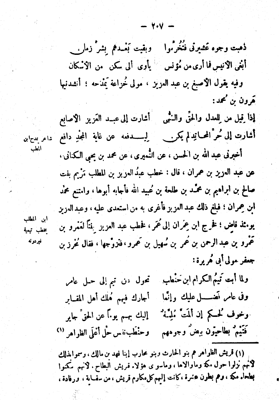 أَخْبَرَنِي عَبْد اللهِ بْن الْحَسَن، عَن النميري، عَن مُحَمَّد بْن يحيى الكناني، عَنْ عَبْدِ العزيز بْن عِمْرَانَ، قال: خطب عَبْد العزيز بْن المطلب مريم بنت صالح بْن إبراهيم بْن مُحَمَّد بْن طلحة بْن عبيد الله فأجابه أَبُوها، وامتنع مُحَمَّد ابن عِمْرَان؛ فبلغ ذلك عَبْد العزيز فأغرى به من استعدى عليه، وعَبْد العزيز يومئذ قاض؛ فخرج ابن عِمْرَان إِلَى عُمَر، فخطب عَبْد العزيز بنتاً لعَمْرو بْن عَمْرو بْن عَبْد الرحمن بْن عُمَر بْن سهيل بْن عَمْرو، فتزوجها، فَقَالَ: محرز بْن جعفر مولى أبي هريرة: