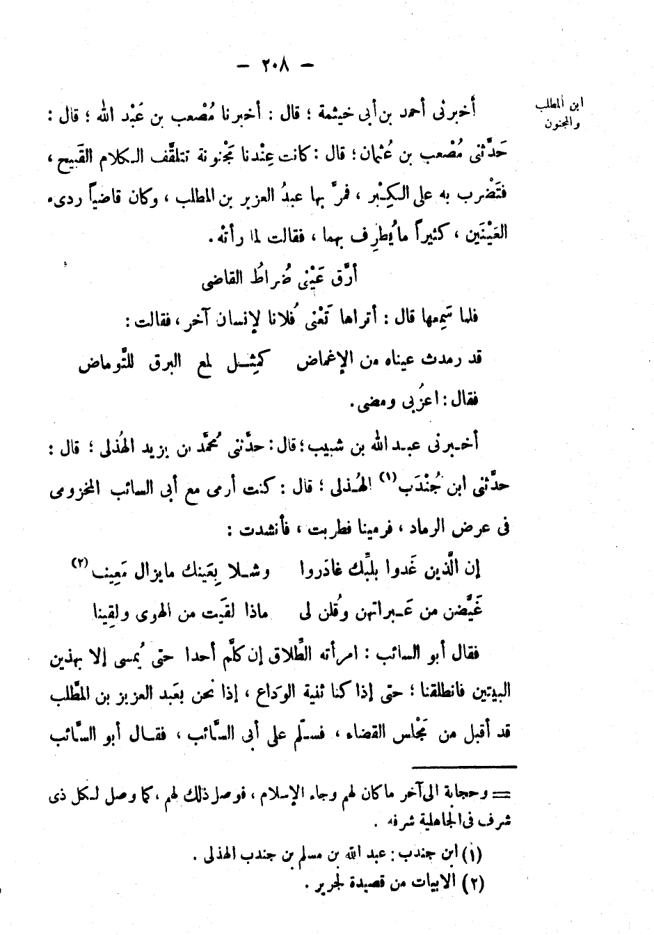 أَخْبَرَنِي عَبْد اللهِ بْن شبيب؛ قال: حَدَّثَنِي مُحَمَّد بْن يزيد الهذلي؛ قال: حَدَّثَنِي ابن جندب الهذلي؛ قال: كنت أرمي مع أبي السائب المخزومي في عرض الرماد، فرمينا فطربت، فأنشدت: