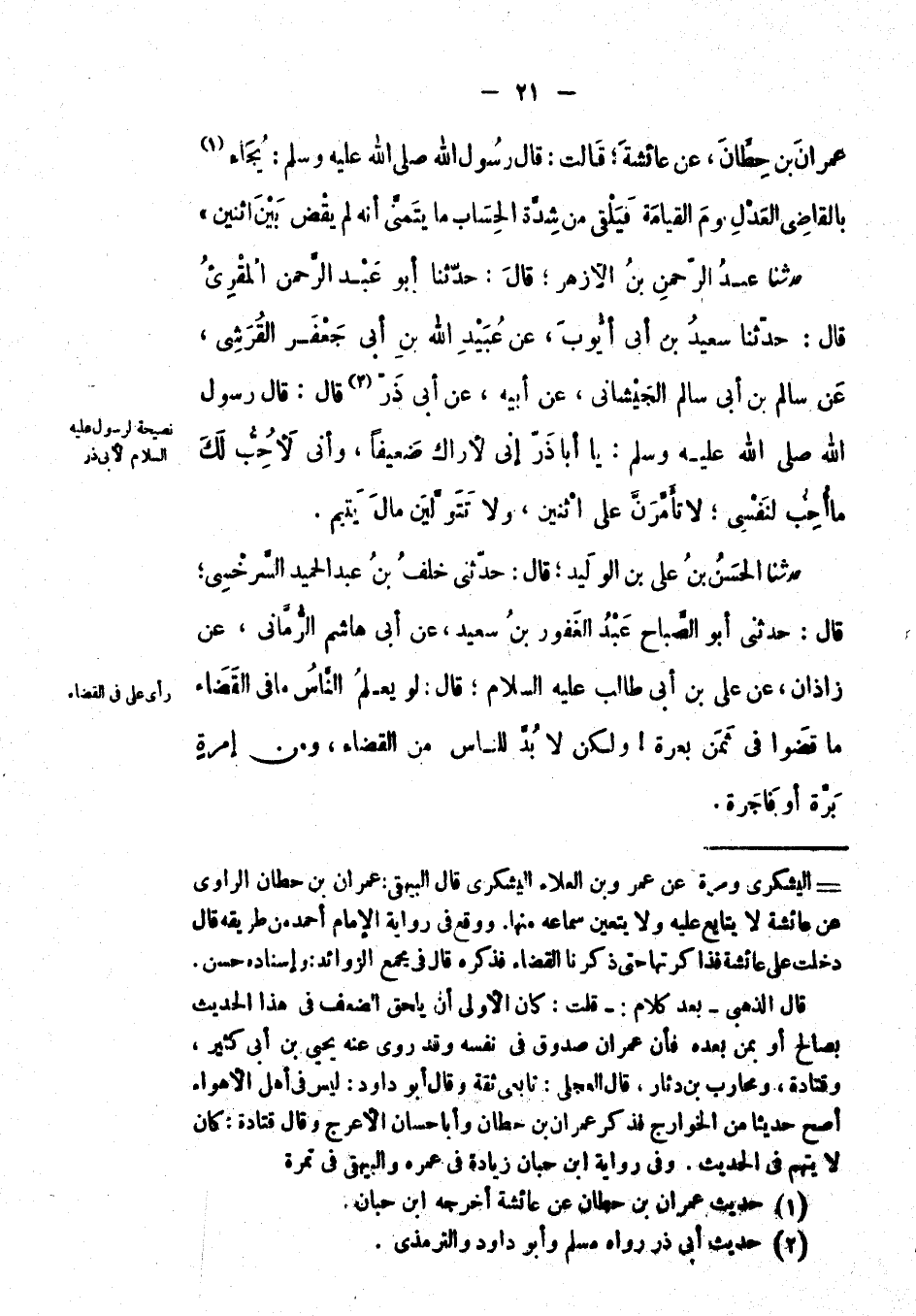 عن عِمْرَان بْن حطان، عَن عَائِشَة؛ قالت: قَالَ رَسُوْلُ اللهِ صَلَّى اللَّهُ عَلَيْهِ وَسَلَّمَ: يجاء بالقاضي العدل يوم القيامة فيلقى من شدة الحساب ما يتمنى أنه لم يقض بين اثنين.