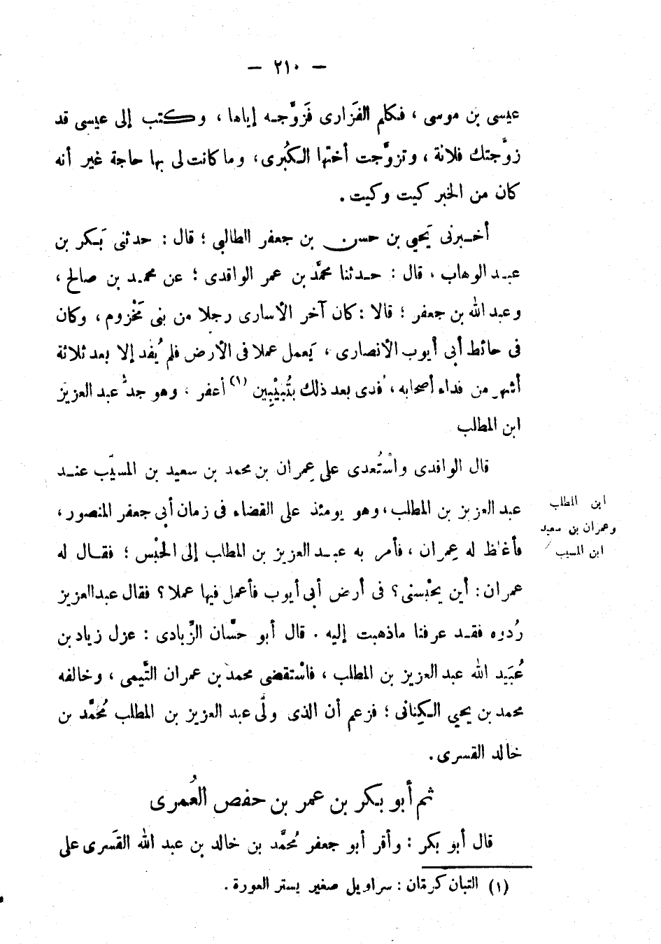 ... قَالَ: أَبُو بكر: وأقر أَبُو جعفر مُحَمَّد بْن خالد بْن عَبْد اللهِ القسري على