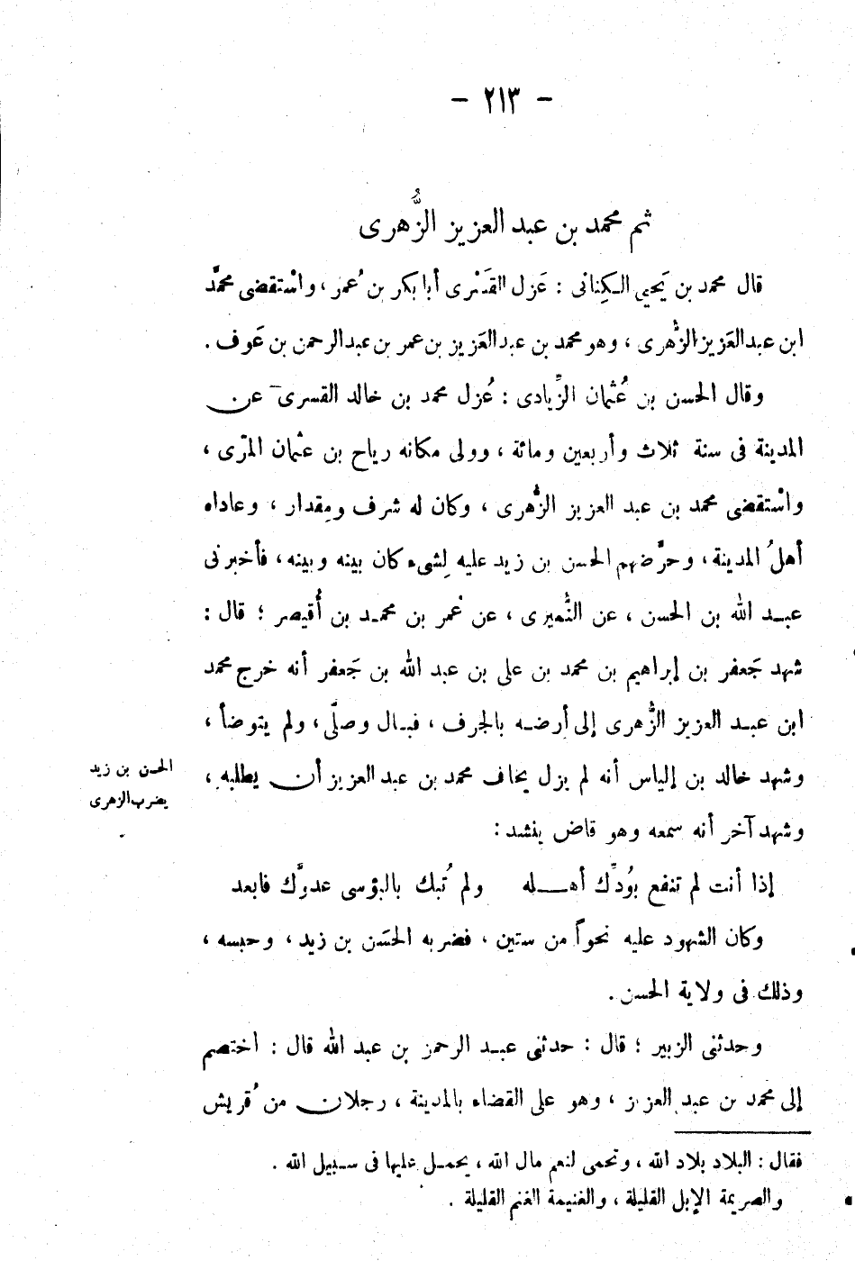 ... قَالَ: مُحَمَّد بْن يحيى الكناني: عزل القسري أبا بكر بْن عُمَر، واستقضى مُحَمَّد ابن عَبْد العزيز الزهري، وهو مُحَمَّد بْن عَبْد العزيز بْن عُمَر بْن عَبْد الرحمن بْن عوف. وقَالَ: الْحَسَن بْن عُثْمَان الزيادي: عزل مُحَمَّد بْن خالد القسري عَن المدينة في سنة ثلاث وأربعين ومائة، وولي مكانه رياح بْن عُثْمَان المري، واستقضى مُحَمَّد بْن عَبْد العزيز الزهري، وكان له شرف ومقدار، وعاداه أهل المدينة، وحرضهم الْحَسَن بْن زيد عليه لشيء كان بينه وبينه.