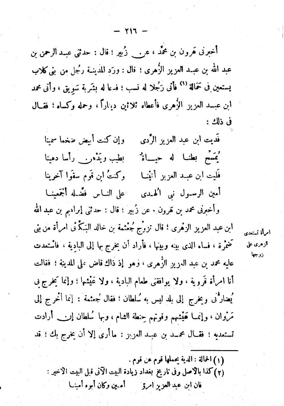 وأَخْبَرَنِي مُحَمَّد بْن هارون، عَن زبير؛ قال: حَدَّثَنِي إبراهيم بْن عَبْد اللهِ ابن عَبْد العزيز الزهري؛ قَالَ: تزوج جعثمة بْن خالد البكرئي امرأة من بني ضمرة، فساء الذي بينه وبينها، فأراد أن يخرج بها إِلَى البادية، فاستعدت عليه مُحَمَّد بْن عَبْد العزيز الزهري، وهو إِذ ذاك قاض على المدينة؛ فقالت أنا امرأة قروية، ولا يوافقني طعام البادية، ولا عيشها؛ وإنما يخرج بي يضارني ويخرج إِلَى بلد ليس به سلطان؛ فَقَالَ: جعثمة: إنما أخرج إِلَى مروان، وإنما عيشهم وقوتهم حنطة الشام، وبها سلطان إن أرادت تستعديه؛ فَقَالَ: مُحَمَّد بْن عَبْد العزيز: ما أرى إِلَّا أن يخرج بك؛ قد