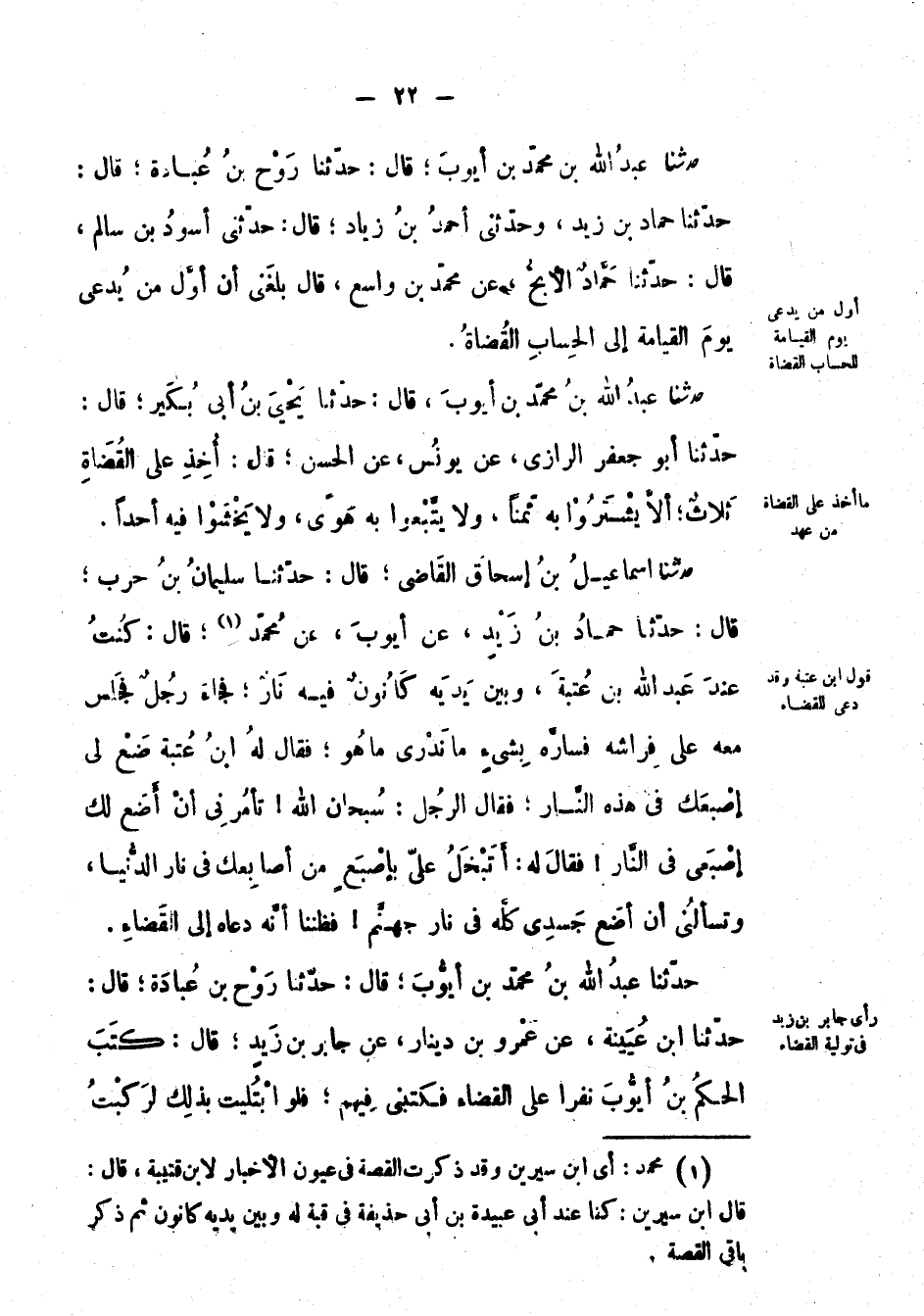 حَدَّثَنَا عَبْدُ اللهِ بْن مُحَمَّد بْن أيوب؛ قال: حَدَّثَنَا روح بْن عبادة؛ قال: حَدَّثَنَا حماد بْن زيد، وحَدَّثَنِي أَحْمَد بْن زياد؛ قال: حَدَّثَنِي أسود بْن سالم، قال: حَدَّثَنَا حماد الأبح، عَن مُحَمَّد بْن واسع، قَالَ: بلغني أن أول من يدعي يوم القيامة إِلَى الحساب القضاة.
