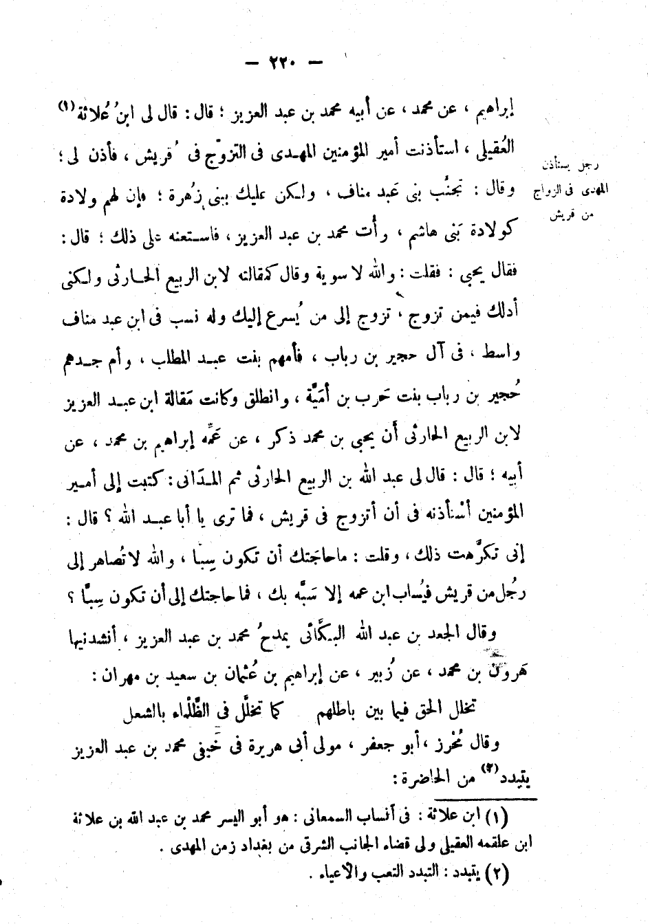 إبراهيم، عَن مُحَمَّد، عَن أبيه مُحَمَّد بْن عَبْد العزيز؛ قال: قَالَ لي: ابن علاثة العقيلي، استأذنت أمير المؤمنين المهدي في التزوج في قريش، فأذن لي؛ وقال: تجنب بني عَبْد مناف، ولكن عليك ببني زهرة؛ فإن لهم ولادة كولادة بني هاشم، وأت مُحَمَّد بْن عَبْد العزيز، فاستعنه على ذلك؛ قال: فَقَالَ: يحيى: فقلت: والله لا سوية وقَالَ: كمقالته لابن الربيع الحارثي ولكني أدلك فيمن تزوج، تزوج إِلَى من يسرع إليك وله نسب في ابن عَبْد مناف واسط، في آل حجير بْن رباب، فأمهم بنت عَبْد المطلب، وأم جدهم حجير بْن رباب بنت حرب بْن أمية، وانطلق وكانت مقالة ابن عَبْد العزيز لابن الربيع الحارثي أن يحيى بْن مُحَمَّد ذكر، عَن عمه إبراهيم بْن مُحَمَّد، عَن أبيه؛ قال: قَالَ لي: عَبْد اللهِ بْن الربيع الحارثي ثم المداني: كتبت إِلَى أمير المؤمنين أستأذنه في أن أتزوج في قريش، فما ترى يا أبا عَبْد اللهِ ? قال: إني تكرهت ذلك، وقلت: ما حاجتك أن تكون سباً، والله لا تصاهر إِلَى رجل من قريش فيساب ابن عمه إِلَّا سبه بك، فما حاجتك إِلَى أن تكون سباً ? وقَالَ: الجعد بْن عَبْد اللهِ البكائي يمدح مُحَمَّد بْن عَبْد العزيز، أنشدنيها هارون بْن مُحَمَّد، عَن زبير، عَن إبراهيم بْن عُثْمَان بْن سعيد بْن مهران: