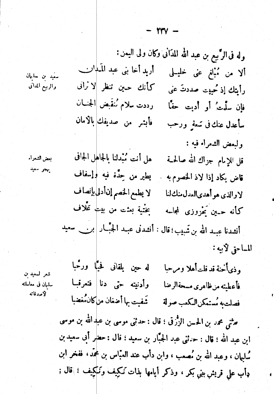 حَدَّثَنِي مُحَمَّد بْن الْحَسَن الزرقي؛ قال: حَدَّثَنِي موسى بْن عَبْد اللهِ بْن موسى ابن عَبْد اللهِ؛ قال: حَدَّثَنِي عَبْدُ الجبار بْن سعيد؛ قال: حضر أبي سعيد بْن سليمان، وعَبْد اللهِ بْن مصعب، وابن دأب عند العباس بْن مُحَمَّد، ففخر ابن دأب على قريش ببني بكر، وذكر أيامها بذات نكيف ونكيف؛ قال: