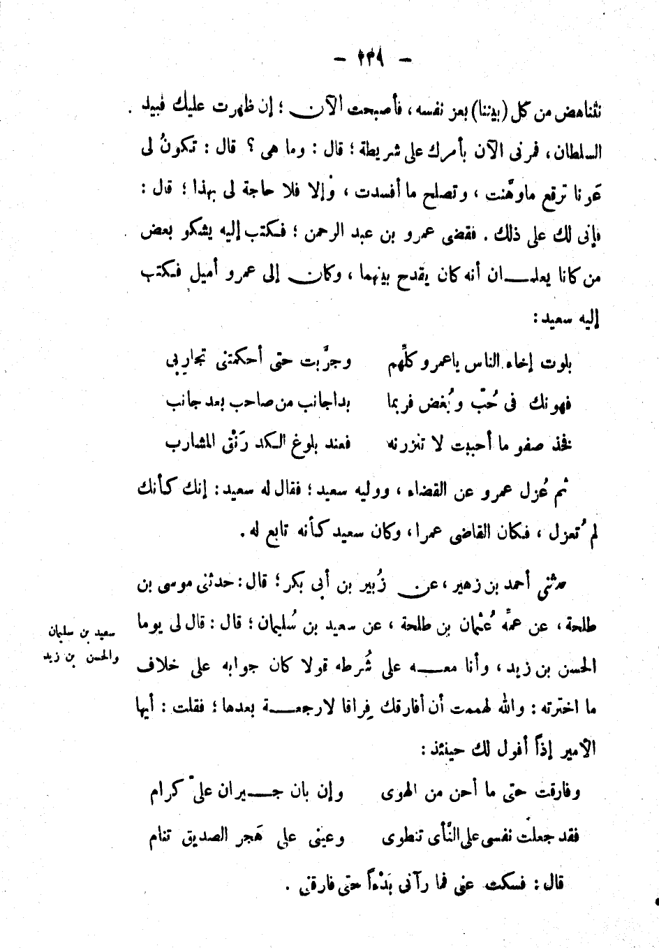 حَدَّثَنِي أَحْمَد بْن زهير، عَن زبير بْن أبي بكر؛ قال: حَدَّثَنِي موسى بْن طلحة، عَن عمه عُثْمَان بْن طلحة، عَن سعيد بْن سليمان؛ قال: قَالَ لي: يوماً الْحَسَن بْن زيد، وأنا معه على شرطه قولاً كان جوابه على خلاف ما اخترته: والله لهممت أن أفارقك فراقاً لا رجعة بعدها؛ فقلت: أيها الأمير إذاً أقول لك حينئذ: