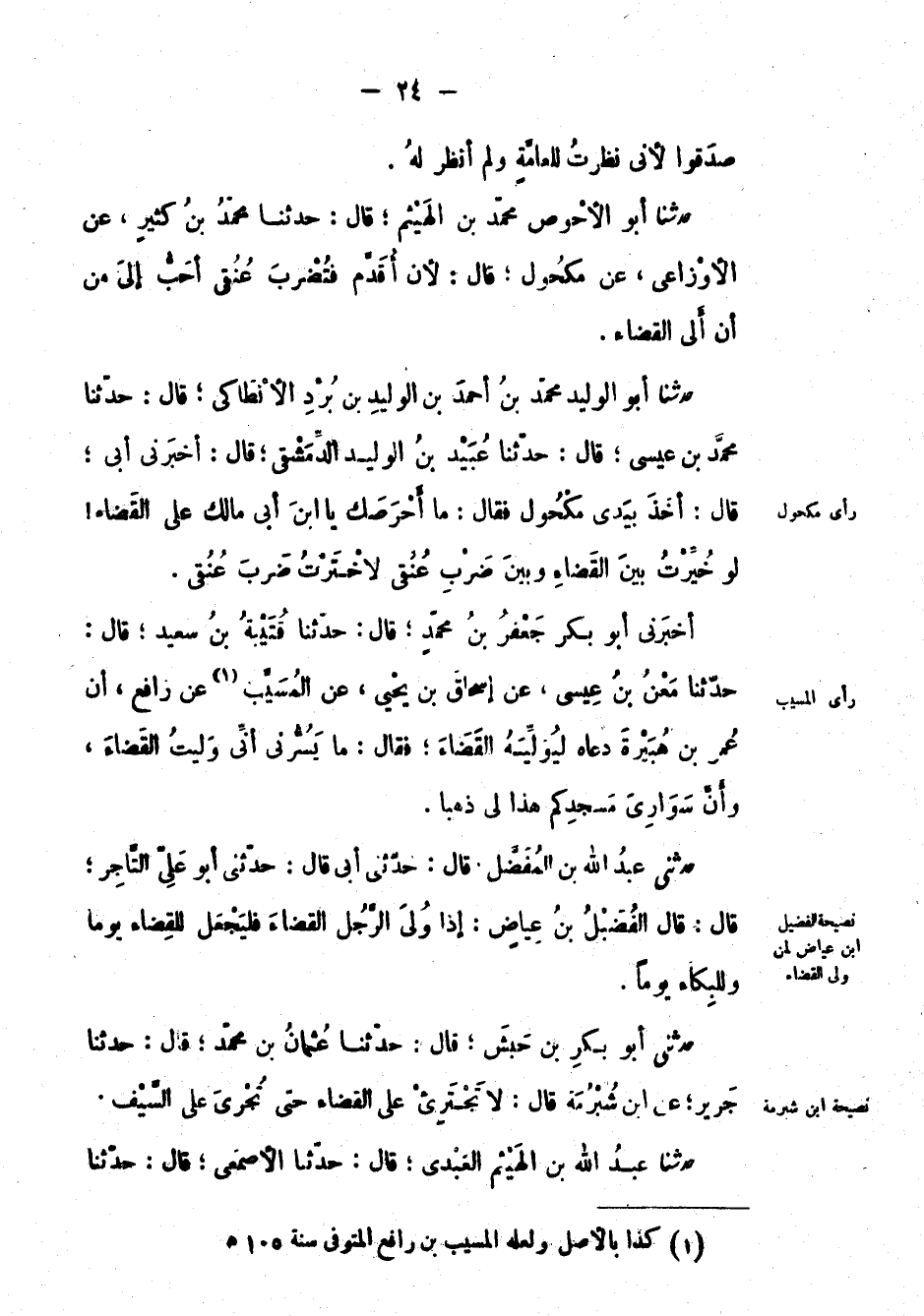 حَدَّثَنَا أَبُو الأحوص مُحَمَّد بْن الهيثم؛ قال: حَدَّثَنَا مُحَمَّد بْن كثير، عَن الأوزاعي، عَن مكحول؛ قال: لأن أقدم فتضرب عنقي أحب إِلَى من أن ألى القضاء.