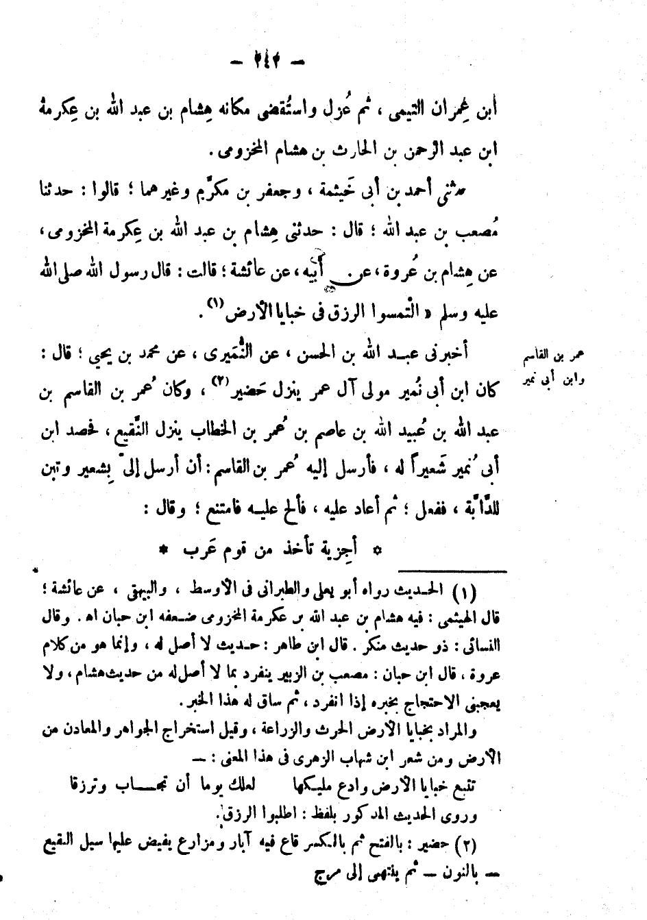 حَدَّثَنِي أَحْمَد بْن أبي خيثمة، وجعفر بْن مكرم وغيرهما؛ قالوا: حَدَّثَنَا مصعب بْن عَبْد اللهِ؛ قال: حَدَّثَنِي هشام بْن عَبْد اللهِ بْن عكرمة المخزومي، عَن هشام بْن عروة، عَن أبيه، عَن عَائِشَة؛ قالت: قَالَ رَسُوْلُ اللهِ صَلَّى اللَّهُ عَلَيْهِ وَسَلَّمَ:التمسوا الرزق في خبايا الأرض.