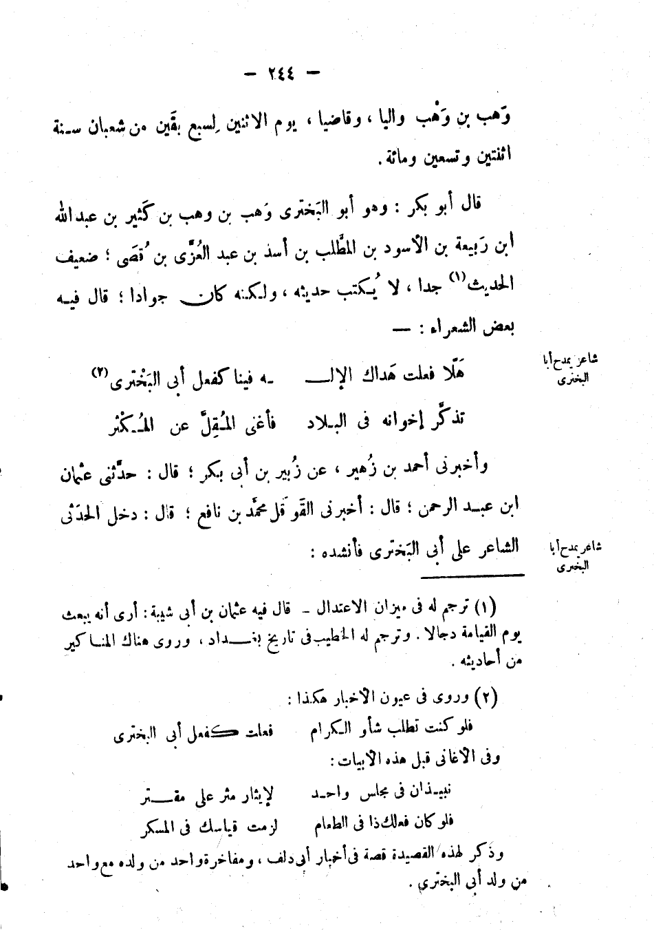 قَالَ: أَبُو بكر: وهو أَبُو البختري وهب بْن وهب بْن كثير بْن عَبْد اللهِ ابن ربيعة بْن الأسود بْن المطلب بْن أسد بْن عَبْد العزى بْن قصي؛ ضعيف الحديث جداً، لا يكتب حديثه، ولكنه كان جواداً؛ قَالَ: فِيْهِ بعض الشعراء: