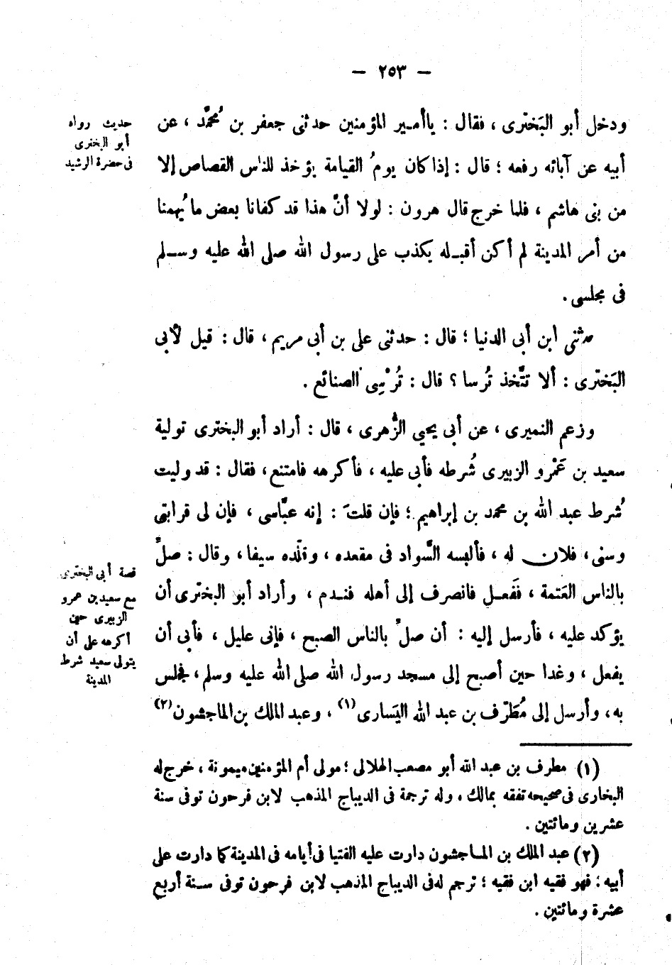 وزعم النميري، عَن أبي يحيى الزهري، قال: أراد أَبُو البختري تولية سعيد بْن عَمْرو الزبيري شرطه فأبى عليه، فأكرهه فامتنع، فقال: قد وليت شرط عَبْد اللهِ بْن مُحَمَّد بْن إبراهيم؛ فإن قلت: إنه عباسي، فإن لي قرابتي وسني، فلان له، فألبسه السواد في مقعده، وقلده سيفاً، وقال: صلى بالناس العتمة، ففعل فانصرف إِلَى أهله فندم، وأراد أَبُو البختري أن يؤكد عليه، فأرسل إليه: أن صَلَّى اللهُ عَلَيْهِ وَآَلِهِ وَسَلَّمَ بالناس الصبح، فإني عليل، فأبى أن يفعل، وغدا حين أصبح إِلَى مسجد رسول الله صَلَّى اللَّهُ عَلَيْهِ وَسَلَّمَ، فجلس به، وأرسل إِلَى مطرف بْن عَبْد اللهِ اليساري، وعَبْد الملك بْن الماجشون