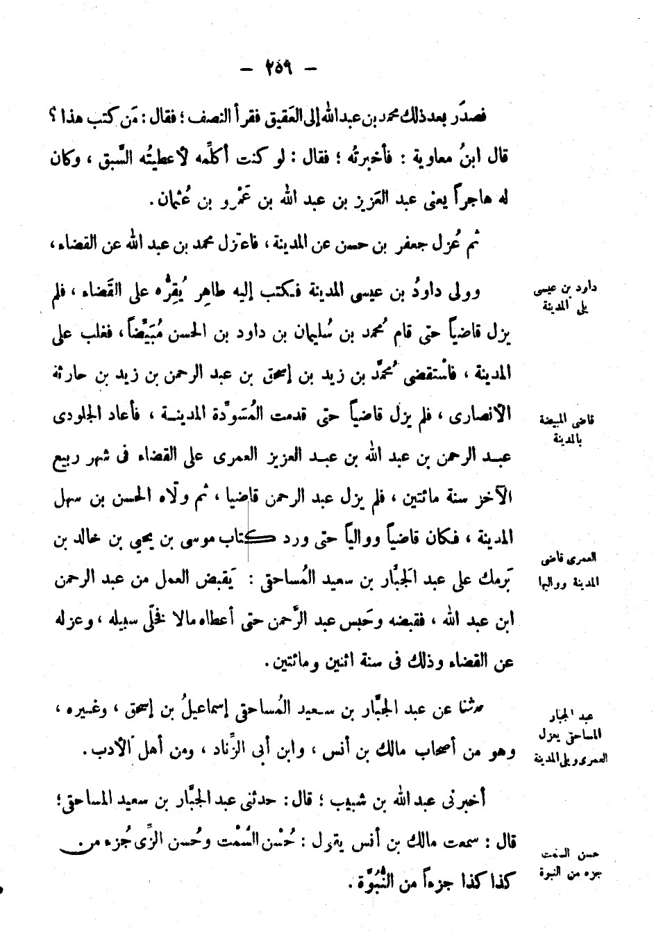 فصدر بعد ذلك مُحَمَّد بْن عَبْد اللهِ إِلَى العقيق فقرأ النصف؛ فقال: من كتب هَذَا ? قَالَ: ابن معاوية: فأخبرته؛ فقال: لو كنت أكلمه لأعطيته السبق، وكان له هاجراً يعني عَبْد العزيز بْن عَبْد اللهِ بْن عَمْرو بْن عثمان. ثم عزل جعفر بْن حسن عَن المدينة، فاعتزل مُحَمَّد بْن عَبْد اللهِ عَن القضاء، وولي داود بْن عيسى المدينة فكتب إليه طاهر يقره على القضاء، فلم يزل قاضياً حتى قام مُحَمَّد بْن سليمان بْن داود بْن الْحَسَن مبيضاً، فغلب على المدينة، فاستقضى مُحَمَّد بْن زيد بْن إسحاق بْن عَبْد الرحمن بْن زيد بْن حارثة الأنصاري، فلم يزل قاضياً حتى قدمت المسودة المدينة، فأعاد الجلودي عَبْد الرحمن بْن عَبْد اللهِ بْن عَبْد العزيز الِعُمَرَي على القضاء في شهر ربيع الآخر سنة مائتين، فلم يزل عَبْد الرحمن قاضياً، ثم ولاه الْحَسَن بْن سهل المدينة، فكان قاضياً ووالياً حتى ورد كتاب موسى بْن يحيى بْن خالد بْن برمك على عَبْد الجبار بْن سعيد المساحقي: يقبض العمل من عَبْد الرحمن ابن عَبْد اللهِ، فقبضه وحبس عَبْد الرحمن حتى أعطاه مالا فخلي سبيله، وعزله عَن القضاء وذلك في سنة اثنين ومائتين.