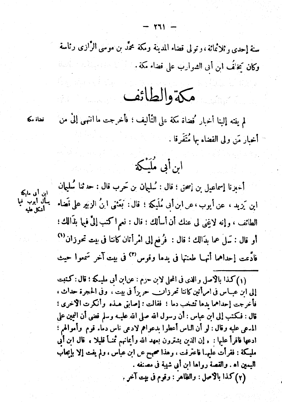 أَخْبَرَنَا إسماعيل بْن إسحاق؛ قال: سليمان بْن حرب قال: حَدَّثَنَا سليمان ابن يزيد، عَن أيوب، عَن ابن أبي مليكة؛ قال: بعثني ابن الزبير على قضاء الطائف، وإنه لا غنى لي عنك أن أسألك؛ قال: نعم اكتب إلي فيما بدا لك؛ أو قال: سل عما بدا لك؛ قال: فرفع إِلَى امرأتان كانتا في بيت تحوزان فادعت إحداهما أنها طعنتها في يدها وقوس في بيت آخر سمعوا حيث