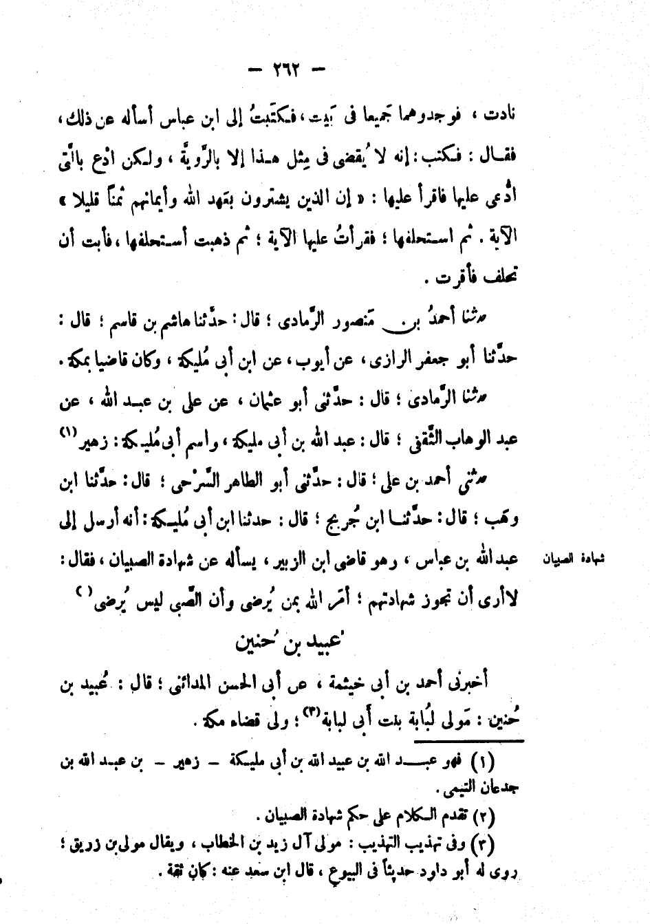 حَدَّثَنَا الرمادي؛ قال: حَدَّثَنِي أَبُو عثمان، عَن علي بْن عَبْد اللهِ، عَنْ عَبْدِ الوهاب الثقفي؛ قال: عَبْد اللهِ بْن أبي مليكة، واسم أبي مليكة: زهير حَدَّثَنِي أَحْمَد بْن علي؛ قال: حَدَّثَنِي أَبُو الطاهر السرحي؛ قال: حَدَّثَنَا ابن وهب؛ قال: حَدَّثَنَا ابن جريج؛ قال: حَدَّثَنَا ابن أبي مليكة: أنه أرسل إِلَى عَبْدِ اللهِ بْن عباس، وهو قاضي ابن الزبير، يسأله عَن شهادة الصبيان، فقال: لا أرى أن تجوز شهادتهم؛ أمر الله بمن يرضى وأن الصبي ليس يرضى.