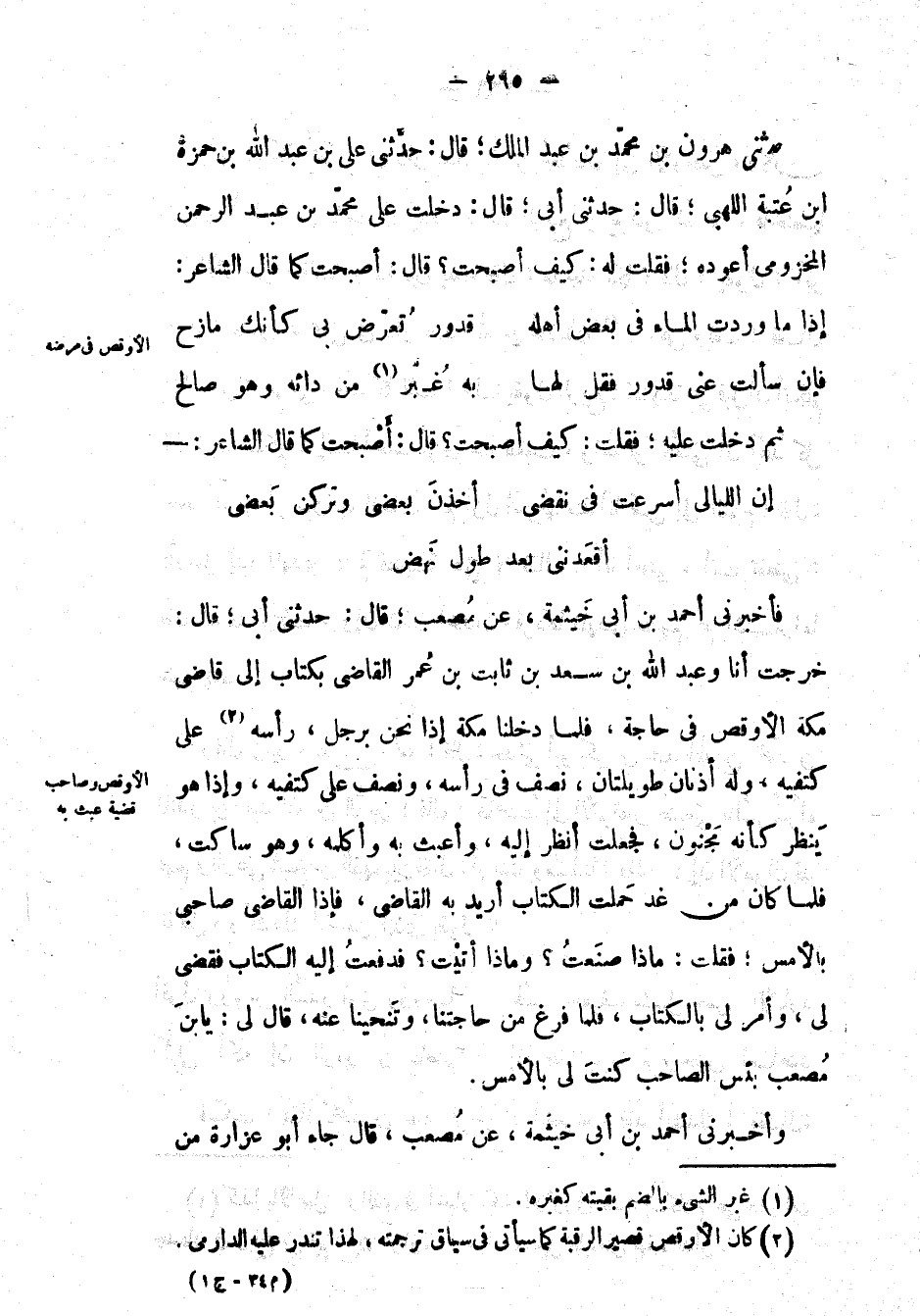 فأَخْبَرَنِي أَحْمَد بْن أبي خيثمة، عَن مصعب؛ قال: حَدَّثَنِي أبي؛ قال: خرجت أنا وعَبْد اللهِ بْن سعد بْن ثابت بْن عُمَر القاضي بكتاب إِلَى قاضي مكة الأوقص في حاجة، فلما دخلنا مكة إِذَا نحن برجل، رأسه على كتفيه، وله أذنان طويلتان، نصف في رأسه، ونصف على كتفيه، وإذا هو ينظر كأنه مجنون، فجعلت أنظر إليه، وأعبث به وأكلمه، وهو ساكت، فلما كان من غد حملت الكتاب أريد به القاضي، فإذا القاضي صاحبي بالأمس؛ فقلت: ماذا صنعت ? وماذا أتيت? فدفعت إليه الكتاب فقضى لي، وأمر لي بالكتاب، فلما فرغ من حاجتنا، وتنحينا عنه، قَالَ لي: يا بْن مصعب بئس الصاحب كنت لي بالأمس.