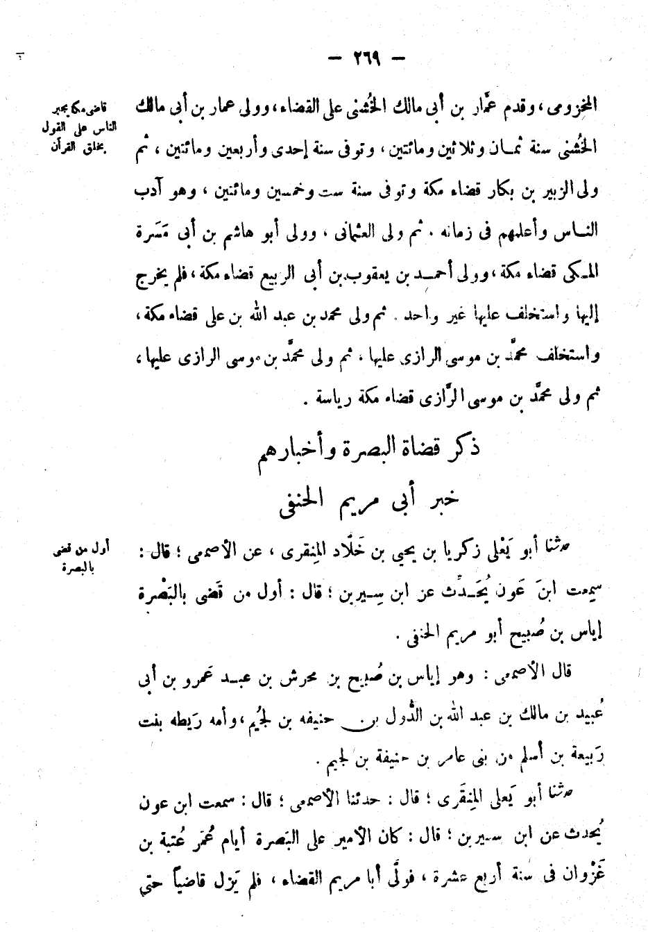 حَدَّثَنَا أَبُو يعلى زكريا بْن يحيى بْن خلاد المنقري، عَن الأصمعي؛ قال: سمعت ابن عون يحدث عَن ابن سيرين؛ قال: أول من قضى بالبصرة إياس بْن صبيح أَبُو مريم الحنفي. قَالَ: الأصمعي: وهو إياس بْن صبيح بْن محرش بْن عَبْد عَمْرو بْن أبي عبيد بْن مالك بْن عَبْد اللهِ بْن الدول بْن حنيفه بْن لجيم، وأمه ريطه بنت ربيعة بْن أسلم من بني عامر بْن حنيفة بْن لجيم.