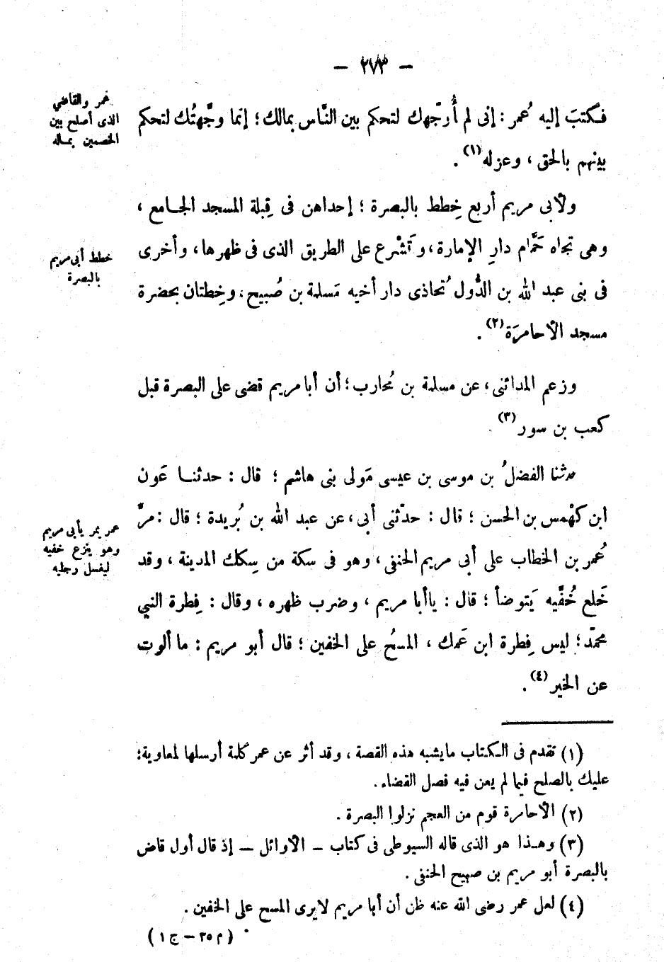 حَدَّثَنَا الفضل بْن موسى بْن عيسى مولى بني هاشم؛ قال: حَدَّثَنَا عون ابن كهمس بْن الْحَسَن؛ قال: حَدَّثَنِي أبي، عَنْ عَبْدِ اللهِ بْن بريدة؛ قال: مر عُمَر بْن الخطاب على أبي مريم الحنفي، وهو في سكة من سكك المدينة، وقد خلع خفيه يتوضأ؛ قال: يا أبا مريم، وضرب ظهره، وقال: فطرة النبي مُحَمَّد؛ ليس فطرة ابن عمك، المسح على الخفين؛ قَالَ: أَبُو مريم: ما ألوت عَن الخير.