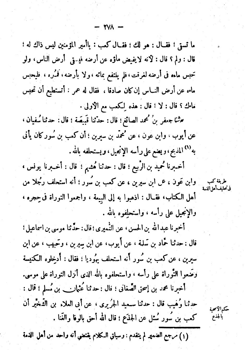أَخْبَرَنَا عَبْد اللهِ بْن الْحَسَن، عَن النميري؛ قال: حَدَّثَنَا موسى بْن إسماعيل؛ قال: حَدَّثَنَا حماد بْن سلمة، عَن أيوب، عَن ابن سيرين، وحبيب، عَن ابن سيرين، عَن كعب بْن سور أنه استحلف يهودياً؛ فقال: أدخلوه الكنيسة وضعوا التوراة على رأسه، واستحلفوه بالله الذي أنزل التوراة على موسى.