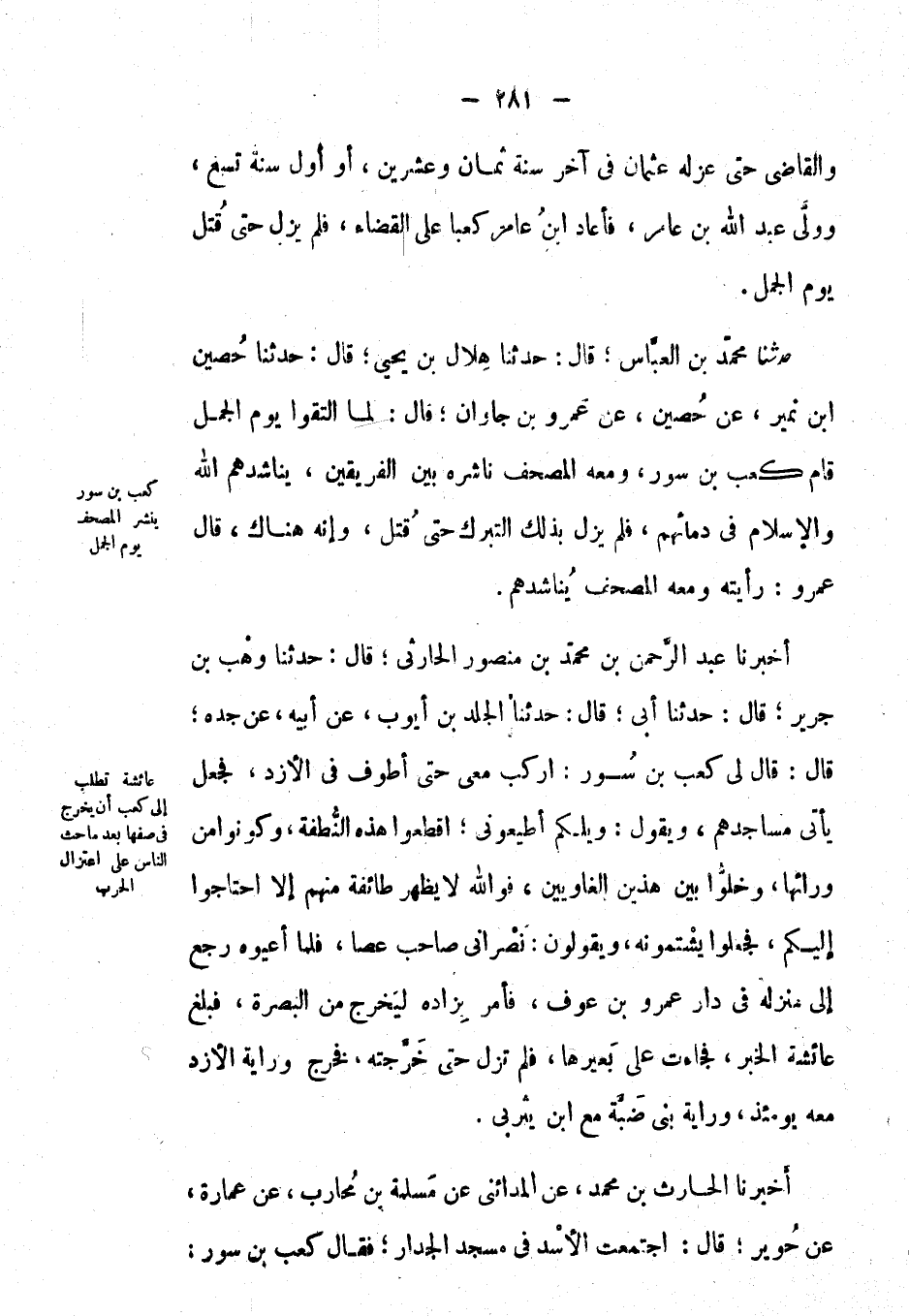 حَدَّثَنَا مُحَمَّد بْن العباس؛ قال: حَدَّثَنَا هلال بْن يحيى؛ قال: حَدَّثَنَا حصين ابن نمير، عَن حصين، عَن عَمْرو بْن جاوان؛ قال: لما التقوا يوم الجمل قام كعب بْن سور، ومعه المصحف ناشره بين الفريقين، يناشدهم الله والإسلام في دمائهم، فلم يزل بذلك التبرك حتى قتل، وإنه هناك، قَالَ عَمْرو: رأيته ومعه المصحف يناشدهم.