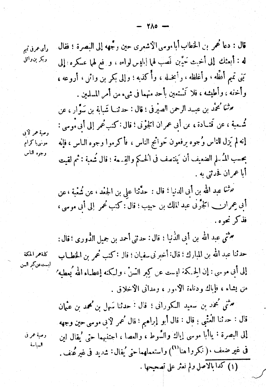 حَدَّثَنِي عَبْدُ اللهِ بْن أبي الدنيا؛ قال: حَدَّثَنِي أَحْمَد بْن جميل الدوري؛ قال: حَدَّثَنَا عَبْدُ اللهِ بْن المبارك؛ قال: أَخْبَرَنِي سُفْيَان؛ قال: كتب عُمَر بْن الخطاب إِلَى أبي موسى: إن الحكمة ليست عَن كبر السن، ولكنه إعطاء الله يعطيه من يشاء، فإياك ودناءة الأمور، ومداني الأخلاق.