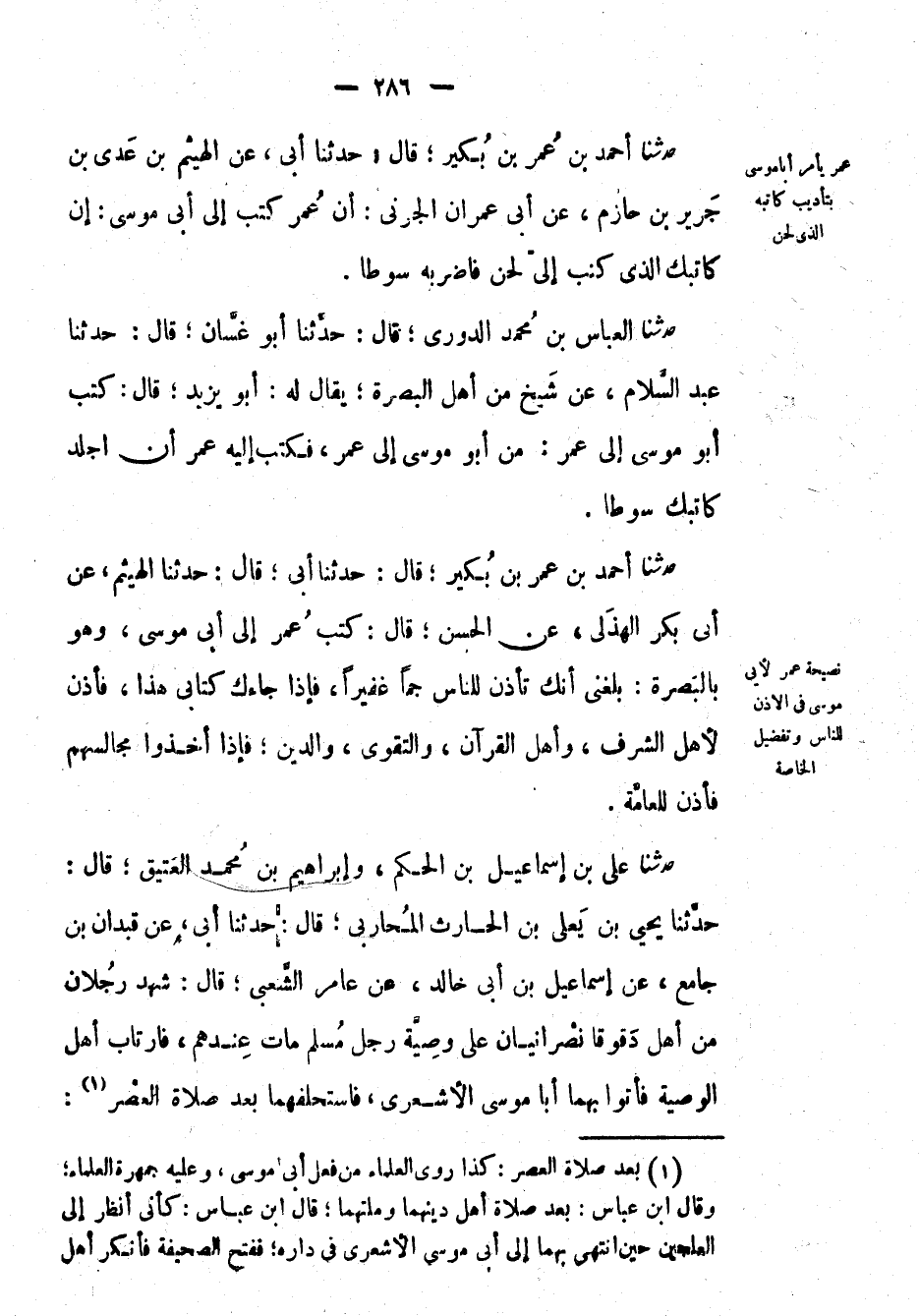 حَدَّثَنَا العباس بْن مُحَمَّد الدوري؛ قال: حَدَّثَنَا أَبُو غسان؛ قال: حَدَّثَنَا عَبْدُ السلام، عَن شيخ من أهل البصرة؛ يُقَالُ لَهُ: أَبُو يزيد؛ قال: كتب أَبُو موسى إِلَى عُمَر: من أَبُو موسى إِلَى عُمَر، فكتب إليه عُمَر أن اجلد كاتبك سوطاً.