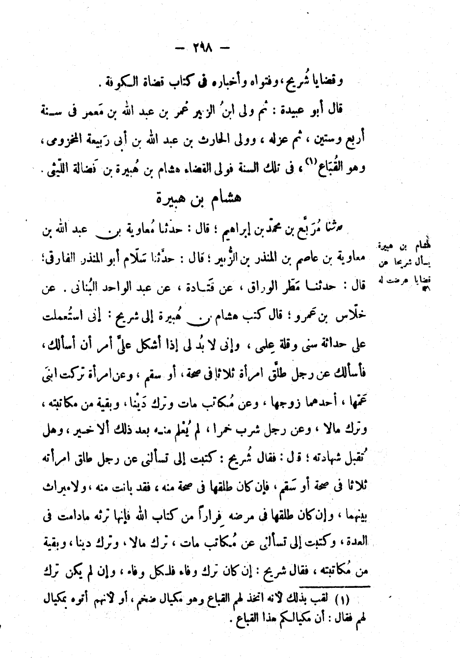 حَدَّثَنَا مربع بْن مُحَمَّد بْن إبراهيم؛ قال: حَدَّثَنَا معاوية بْن عَبْد اللهِ بْن معاوية بْن عاصم بْن المنذر بْن الزبير؛ قال: حَدَّثَنَا سلام أَبُو المنذر الفارقي؛ قال: حَدَّثَنَا مطر الوراق، عَن قتادة، عَنْ عَبْدِ الواحد البناني. عَن خلاس بْن عَمْرو؛ قَالَ: كتب هشام بْن هبيرة إِلَى شريح: إني استعملت على حداثة سني وقلة علمي، وإني لا بد لي إِذَا أشكل علي أمر أن أسألك، فأسألك عَن رجل طلق امرأة ثلاثاً في صحة، أو سقم، وعن امرأة تركت ابني عمها، أحدهما زوجها، وعن مكاتب مات وترك ديناً، وبقية من مكاتبته، وترك مالاً، وعن رجل شرب خمراً، لم يعلم منه بعد ذلك ألا خير، وهل تقبل شهادته؛ قال: فَقَالَ: شريح: كتبت إلي تسألني عَن رجل طلق امرأته ثلاثاً في صحة أو سقم، فإن كان طلقها في صحة منه، فقد بانت منه، ولا ميراث بينهما، وإن كان طلقها في مرضه فراراً من كتاب الله فإنها ترثه ما دامت في العدة، وكتبت إلي تسألني عَن مكاتب مات، ترك مالاً، وترك ديناً، وبقية من مكاتبته، فَقَالَ: شريح: إن كان ترك وفاء فلكل وفاء، وإن لم يكن ترك