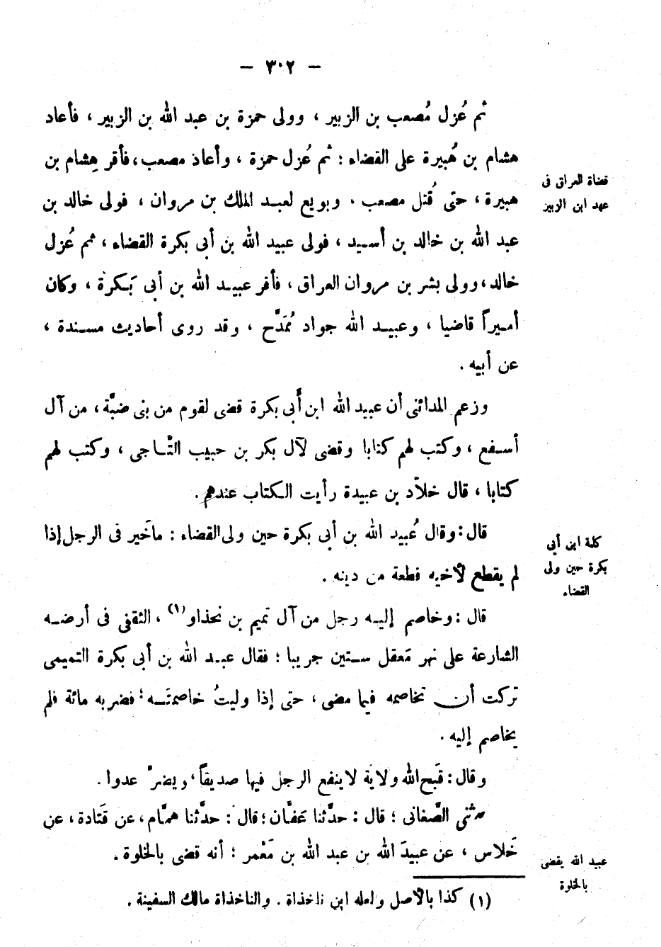 ثم عزل مصعب بْن الزبير، وولي حمزة بْن عَبْد اللهِ بْن الزبير، فأعاد هشام بْن هبيرة على القضاء؛ ثم عزل حمزة، وأعاد مصعب، فأقر هشام بْن هبيرة، حتى قتل مصعب، وبويع لعَبْد الملك بْن مروان، فولي خالد بْن عَبْد اللهِ بْن خالد بْن أسيد، فولي عبيد الله بْن أبي بكرة القضاء، ثم عزل خالد، وولي بشر بْن مروان العراق، فأقر عبيد الله بْن أبي بكرة، وكان أميراً قاضياً، وعبيد الله جواد ممدح، وقد روى أحاديث مسندة، عَن أبيه.