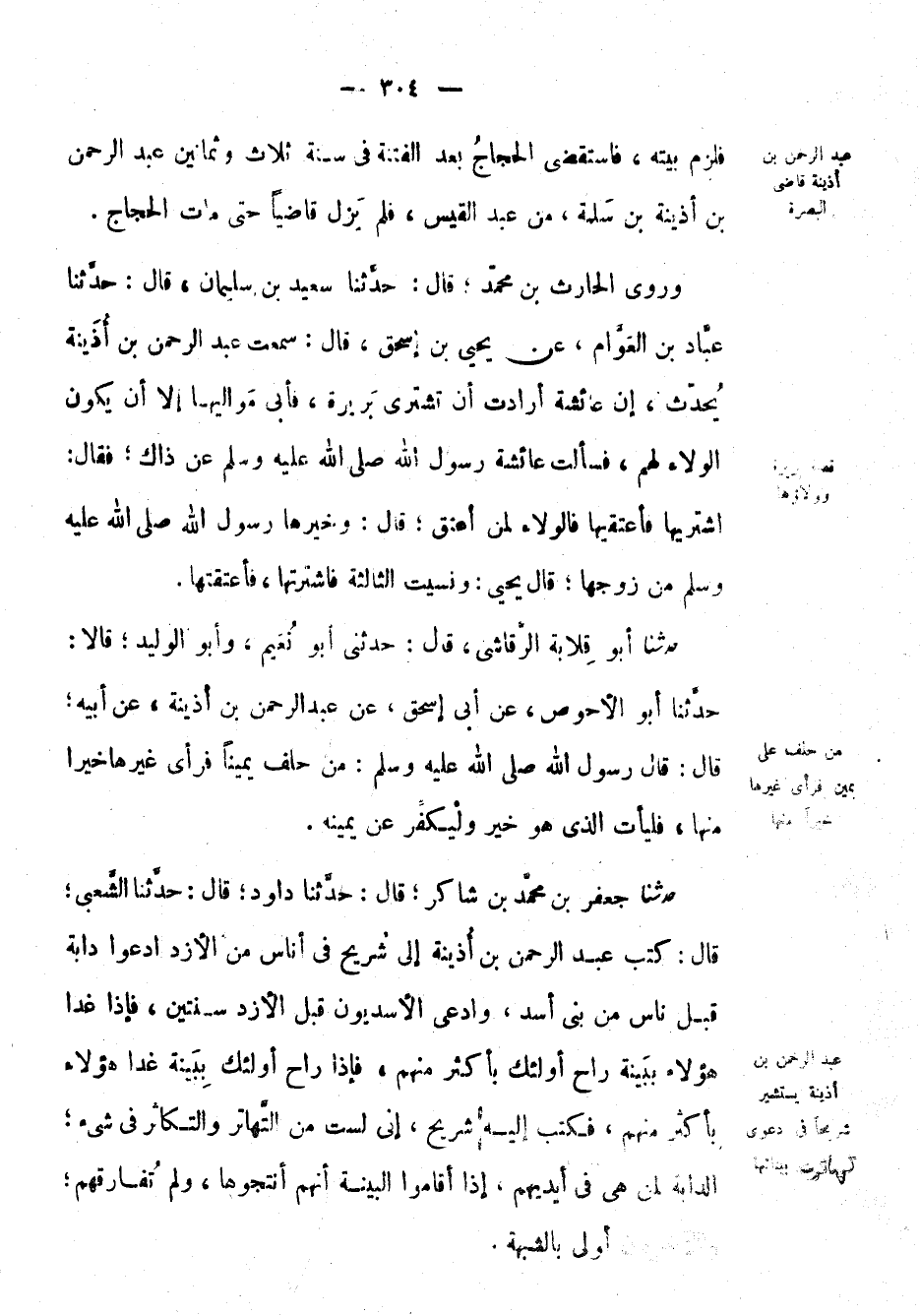 وروى الحارث بْن مُحَمَّد؛ قال: حَدَّثَنَا سعيد بْن سليمان، قال: حَدَّثَنَا عباد بْن العوام، عَن يحيى بْن إسحاق، قال: سمعت عَبْد الرحمن بْن أذينة يحدث، إن عَائِشَة أرادت أن تشتري بريرة، فأبى مواليها إِلَّا أن يكون الولاء لهم، فسألت عَائِشَة رَسُوْلُ اللهِ صَلَّى اللَّهُ عَلَيْهِ وَسَلَّمَ عَن ذاك؛ فقال: اشتريها فأعتقيها فالولاء لمن أعتق؛ قال: وخيرها رَسُوْلُ اللهِ صَلَّى اللَّهُ عَلَيْهِ وَسَلَّمَ من زوجها؛ قَالَ: يحيى: ونسيت الثالثة فاشترتها، فأعتقتها.