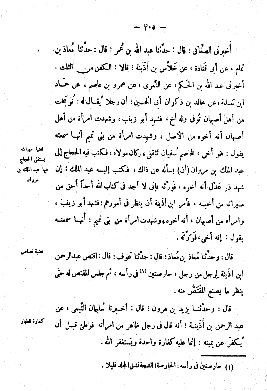 قال: وَحَدَّثَنَا معاذ بْن معاذ؛ قال: حَدَّثَنَا عوف؛ قال: اقتص عَبْد الرحمن ابن اذينة لرجل من رجل، حارصتين في رأسه، ثم جلس المقتص له حتى ينظر ما يصنع المقتص منه. قال: وَحَدَّثَنَا يزيد بْن هارون؛ قال: أَخْبَرَنَا سليمان التيمي، عَنْ عَبْدِ الرحمن بْن أذينة؛ أنه قَالَ: في رجل ظاهر من امرأته فوطئ قبل أن يكفر عَن يمينه: إنما عليه كفارة واحدة ويستغفر الله.