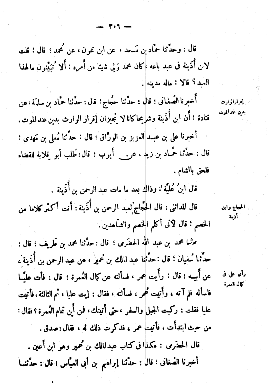 حَدَّثَنَا مُحَمَّد بْن عَبْد اللهِ الحضرمي؛ قال: حَدَّثَنَا مُحَمَّد بْن طريف؛ قال: حَدَّثَنَا سُفْيَان؛ قال: حَدَّثَنَا عَبْدُ الملك بْن عمير، عَنْ عَبْدِ الرحمن بْن أذينة، عَن أبيه؛ قال: رأيت عُمَر، فسألته عَن كمال الِعُمَرَة؛ قال: فأت علياً فاسأله فلم آته، وأتيت عُمَر، فسألته، فقال: إيت علياً، ثم الثالثة، فأتيت علياً فقلت: ركبت الجبل والسفر، حتى أتيتك، فمن أين تمام ال عَمْرَة? فقال: من حَيْثُ ابتدأت، فأتيت عُمَر، فذكرت ذلك له، فقال: صدق. قَالَ: الحضرمي: هكذا في كتاب عَبْد الملك بْن عمير وهو ابن أعين.