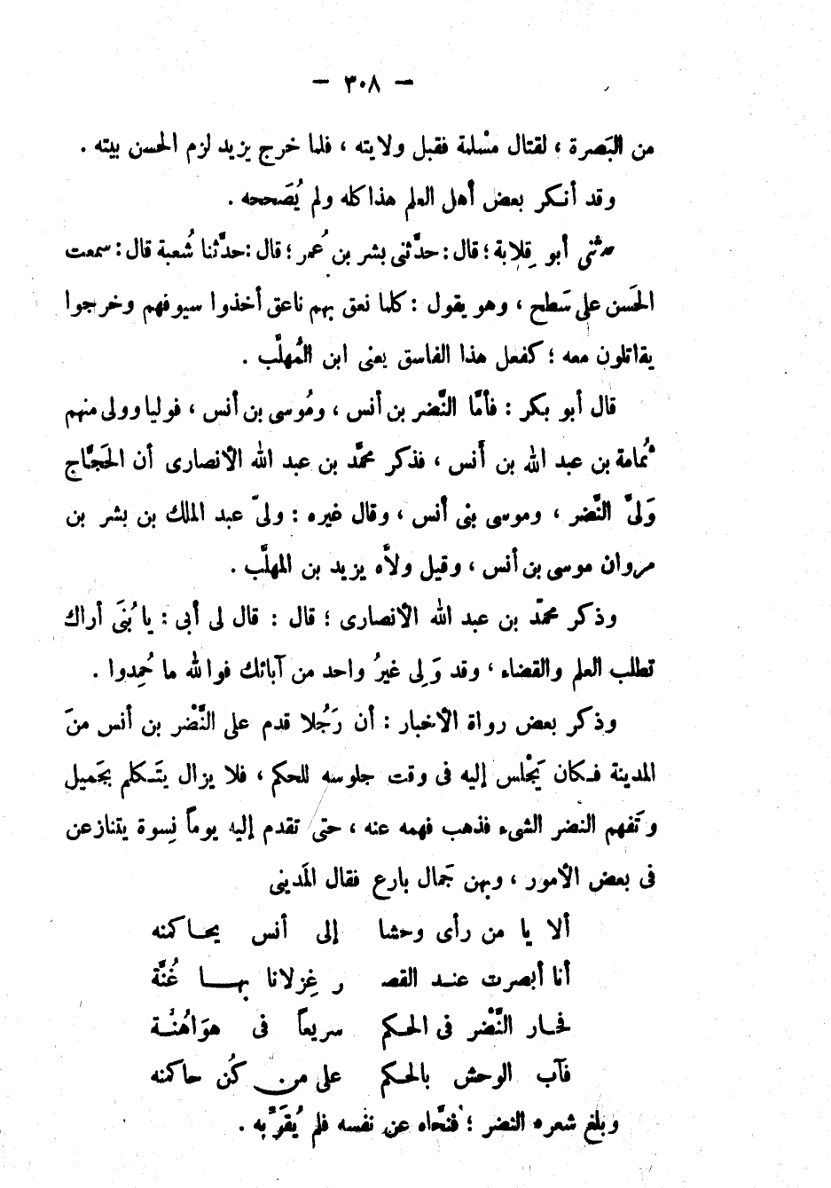 حَدَّثَنِي أَبُو قلابة؛ قال: حَدَّثَنِي بشر بْن عُمَر؛ قال: حَدَّثَنَا شعبة قال: سمعت الْحَسَن على سطح، وهو يقول: كلما نعق بهم ناعق أخذوا سيوفهم وخرجوا يقاتلون معه؛ كفعل هَذَا الفاسق يعني ابن المهلب. قَالَ: أَبُو بكر: فأما النضر بْن أنس، وموسى بْن أنس، فوليا وولي منهم ثمامة بْن عَبْد اللهِ بْن أنس، فذكر مُحَمَّد بْن عَبْد اللهِ الأنصاري أن الحجاج ولي النضر، وموسى بني أنس، وقَالَ: غيره: ولي عَبْد الملك بْن بشر بْن مروان موسى بْن أنس، وقيل ولاه يزيد بْن المهلب. وذكر مُحَمَّد بْن عَبْد اللهِ الأنصاري؛ قال: قَالَ لي: أبي: يا بني أراك تطلب العلم والقضاء، وقد ولي غير واحد من آبائك فوالله ما حمدوا.
