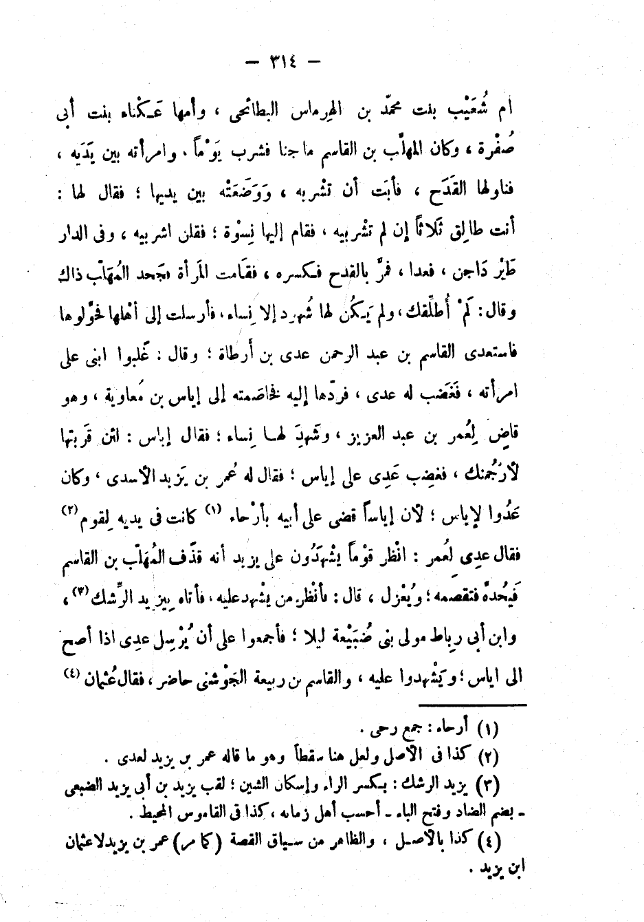 أم شُعَيْب بنت مُحَمَّد بْن الهرماس البطائحي، وأمها عكناء بنت أبي صفرة، وكان المهلب بْن القاسم ماجناً فشرب يوماً، وامرأته بين يديه، فناولها القدح، فأبت أن تشربه، ووضعته بين يديها؛ فَقَالَ لَهَا: أنت طالق ثلاثاً إن لم تشربيه، فقام إليها نسوة؛ فقلن اشربيه، وفي الدار طير داجن، فعدا، فمر بالقدح فكسره، فقامت المرأة فجحد المهلب ذاك وقال: لم أطلقك، ولم يكن لها شهود إِلَّا نساء، فأرسلت إِلَى أهلها فحولوها فاستعدى القاسم بْن عَبْد الرحمن عدي بْن أرطاة؛ وقال: غلبوا ابني على امرأته، فغضب له عدي، فردها إليه فخاصمته إِلَى إياس بْن معاوية، وهو قاض لِعُمَرَ بْن عَبْد العزيز، وشهد لها نساء؛ فَقَالَ: إياس: لئن قربتها لأرجمنك، فغضب عدي على إياس؛ فَقَالَ لَهُ عُمَر بْن يزيد الأسدي، وكان عدواً لإياس؛ لأن إياساً قضى على أبيه بأرحاء كانت في يديه لقوم فَقَالَ: عدي لِعُمَرَ: انظر قوماً يشهدون على يزيد أنه قذف المهلب بْن القاسم فيحده فتقصمه؛ ويعزل، قال: فأنظر من يشهد عليه، فأتاه بيزيد الرشك، وابن أبي رباط مولى بني ضبيعة ليلا؛ فأجمعوا على أن يرسل عدي إِذَا أصح إِلَى اياس؛ ويشهدوا عليه، والقاسم بْن ربيعة الجوشني حاضر، فَقَالَ: عثمان