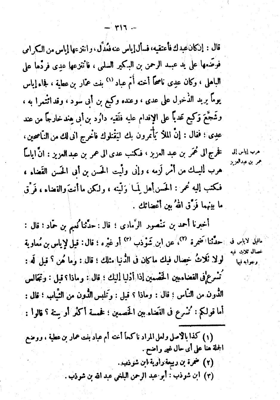 أَخْبَرَنَا أَحْمَد بْن منصور الرمادي؛ قال: حَدَّثَنَا نعيم بْن حماد؛ قال: حَدَّثَنَا ضمرة، عَن ابن شوذب أو غيره؛ قال: قيل لإياس بْن معاوية لولا ثلاث خصال فيك ما كان في الدنيا مثلك؛ قال: وما هن ? قيل له: تسرع في القضاء بين الخصمين إِذَا أدليا إليك؛ قال: وماذا ? قيل: وتجالس الدون من الناس؛ قال: وماذا ? قيل: وتلبس الدون من الثياب؛ قال: أما قولكم: تسرع في القضاء بين الخصمين؛ فخمسة أكثر أو ستة ? قالوا: