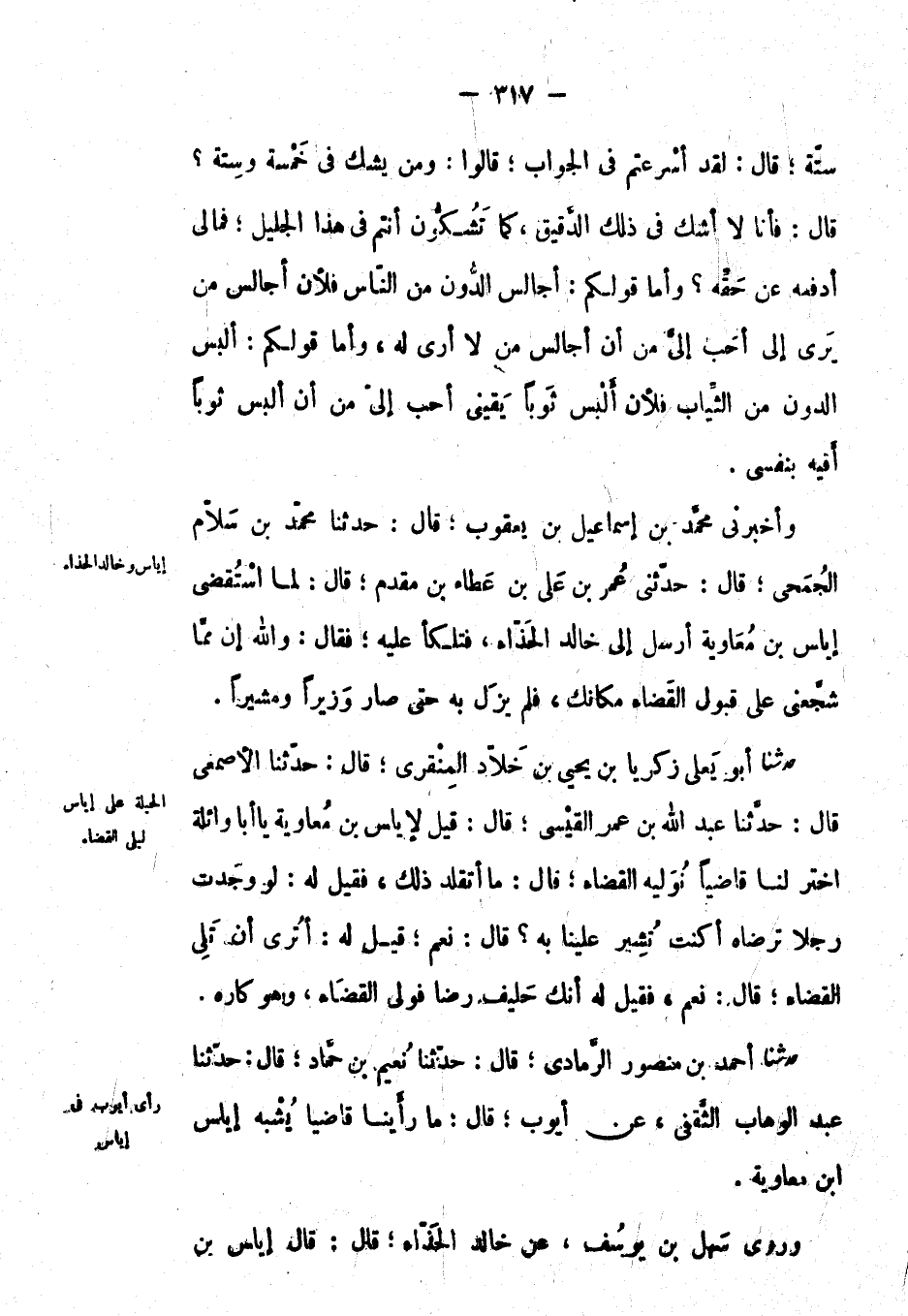 حَدَّثَنَا أَبُو يعلى زكريا بْن يحيى بْن خلاد المنقري؛ قال: حَدَّثَنَا الأصمعي قال: حَدَّثَنَا عَبْدُ اللهِ بْن عُمَر القيسي؛ قال: قيل لإياس بْن معاوية يا أبا وائلة اختر لنا قاضياً نوليه القضاء؛ قال: ما أتقلد ذلك، فقيل له: لو وجدت رجلاً ترضاه أكنت تشير علينا به ? قال: نعم؛ قيل له: أترى أن تلي القضاء؛ قال: نعم، فقيل له أنك حليف رضا فولي القضاء، وهو كاره.