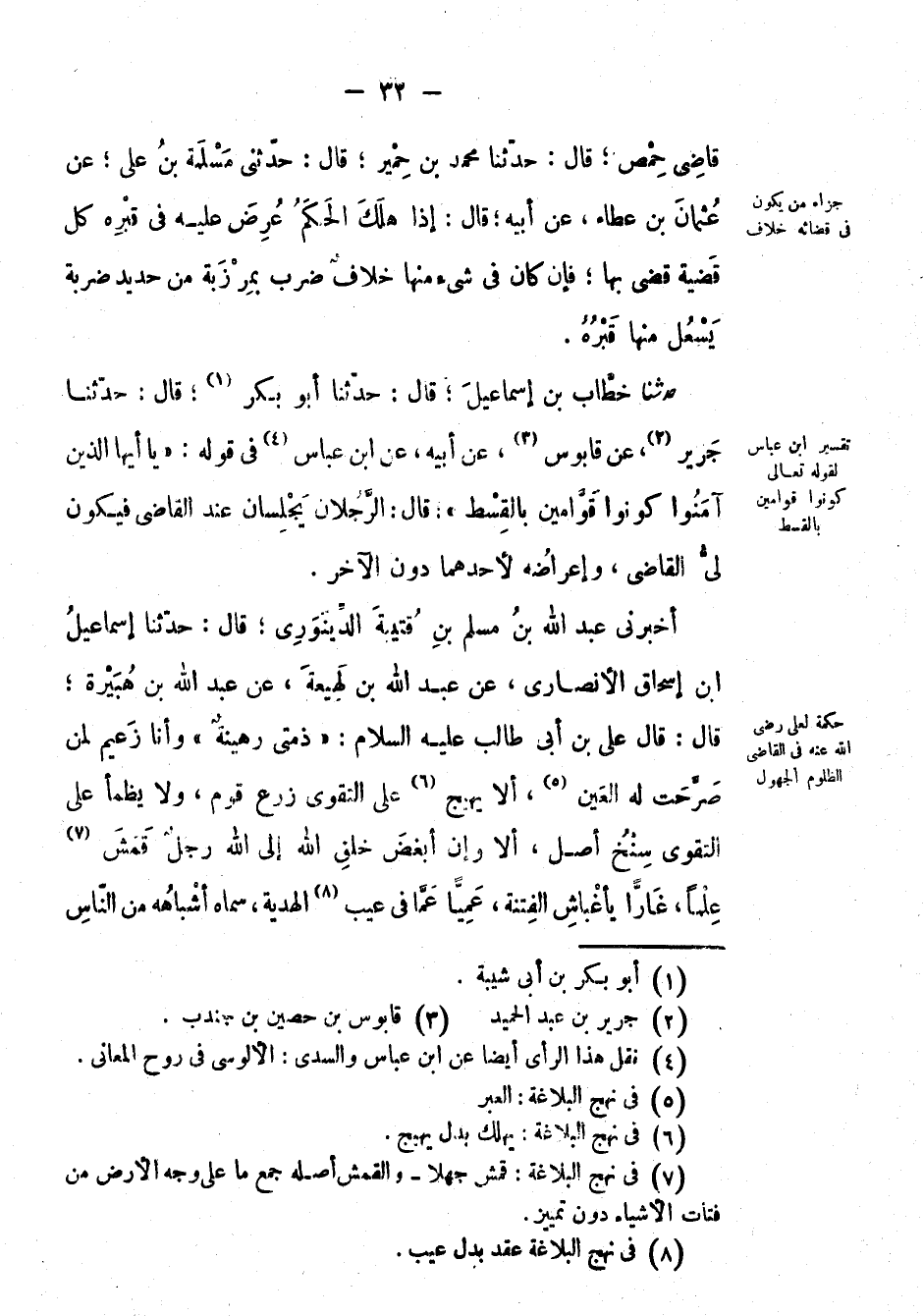 حَدَّثَنَا خطاب بْن إسماعيل؛ قال: حَدَّثَنَا أَبُو بكر؛ قال: حَدَّثَنَا جرير، عَن قابوس، عَن أبيه، عَن ابْن عَبَّاس في قوله: {يَا أَيُّهَا الَّذِينَ آمَنُواْ كُونُواْ قَوَّامِينَ بِالْقِسْطِ [النِّسَاء: 135} قال: الرجلان يجلسان عند القاضي فيكون لي القاضي، وإعراضه لأحدهما دون الآخر.
