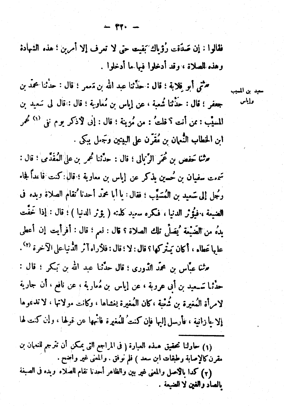 حَدَّثَنِي أَبُو قلابة؛ قال: حَدَّثَنَا عَبْدُ اللهِ بْن مَعْمَر؛ قال: حَدَّثَنَا مُحَمَّد بْن جعفر؛ قال: حَدَّثَنَا شعبة، عَن إياس بْن معاوية؛ قال: قَالَ لي: سعيد بْن المسيب: ممن أنت ? قلت: من مزينة؛ قال: إني لأذكر يوم نفي عُمَر بْن الخطاب النعمان بْن مقرن على البيتين وجعل يبكي.