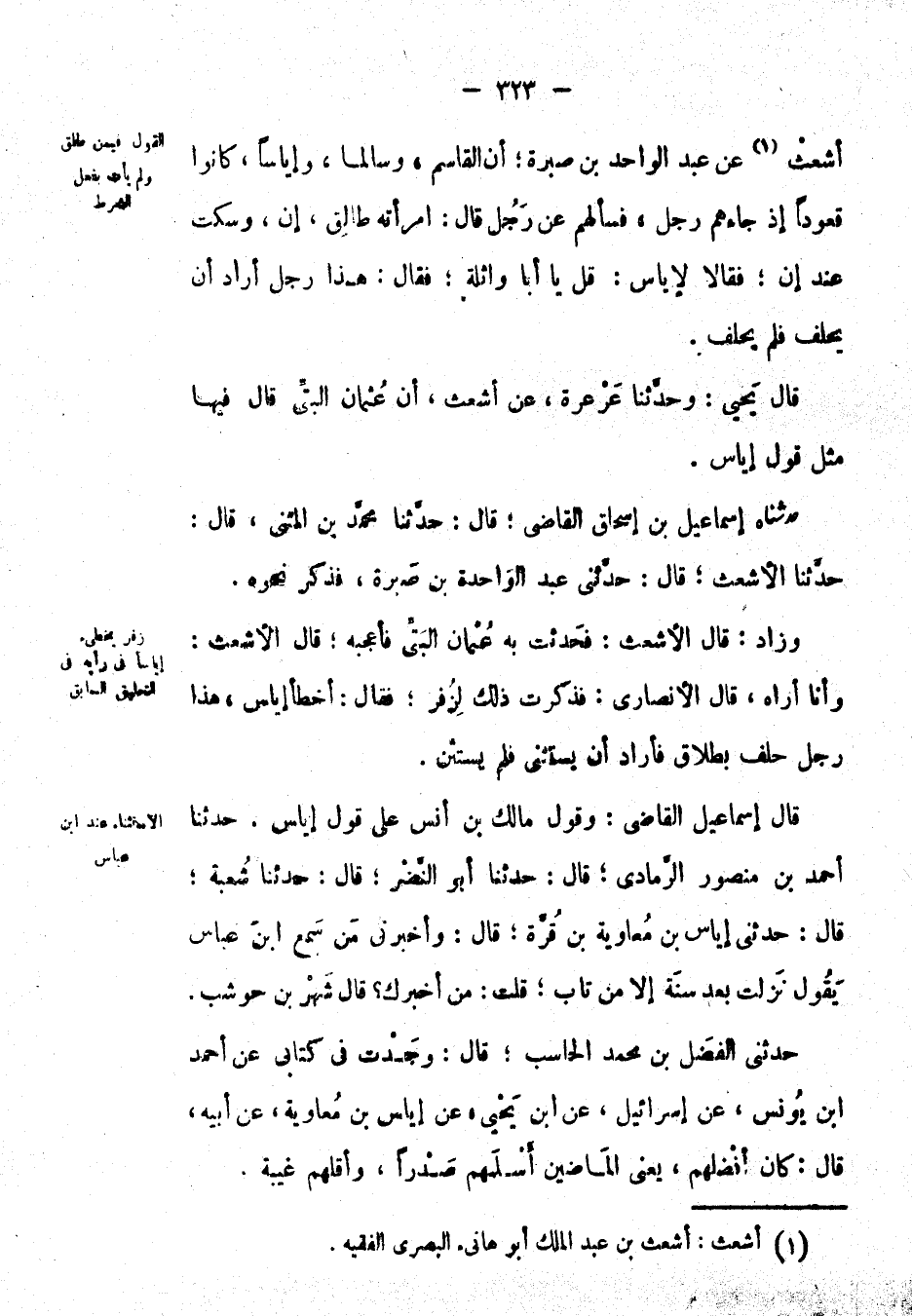 حَدَّثَنَاه إسماعيل بْن إسحاق القاضي؛ قال: حَدَّثَنَا مُحَمَّد بْن المثنى، قال: حَدَّثَنَا الأشعث؛ قال: حَدَّثَنِي عَبْدُ الواحدة بْن صبرة، فذكر نحوه. وزاد: قَالَ: الأشعث: فحدثت به عُثْمَان البتي فأعجبه؛ قَالَ: الأشعث: وأنا أراه، قَالَ: الأنصاري: فذكرت ذلك لزفر؛ فقال: أخطأ إياس، هَذَا رجل حلف بطلاق فأراد أن يستثنى فلم يستثن.