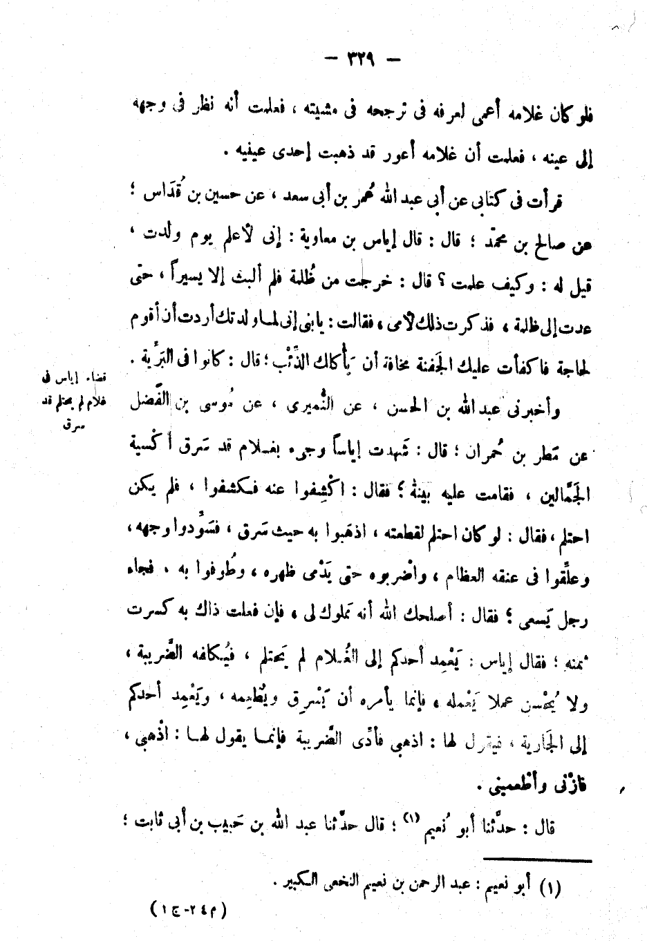 وأَخْبَرَنِي عَبْد اللهِ بْن الْحَسَن، عَن النميري، عَن موسى بْن الفضل عَن مطر بْن حمران؛ قال: شهدت إياساً وجئ بغلام قد سرق أكسية الجمالين، فقامت عليه بينة؛ فقال: اكشفوا عنه فكشفوا، فلم يكن احتلم، فقال: لو كان احتلم لقطعته، اذهبوا به حَيْثُ سرق، فسودوا وجهه، وعلقوا في عنقه العظام، واضربوه حتى يدمي ظهره، وطوفوا به، فجاء رجل يسعى؛ فقال: أصلحك الله أنه مملوك لي، فإن فعلت ذاك به كسرت ثمنه؛ فَقَالَ: إياس: يعمد أحدكم إِلَى الغلام لم يحتلم، فيكلفه الضريبة، ولا يحسن عملاً يعمله، فإنما يأمره أن يسرق ويطعمه، ويعمد أحدكم إِلَى الجارية، فيقول لها: اذهبي فأدي الضريبة فإنما يقول لها: اذهبي، فازني وأطعميني.