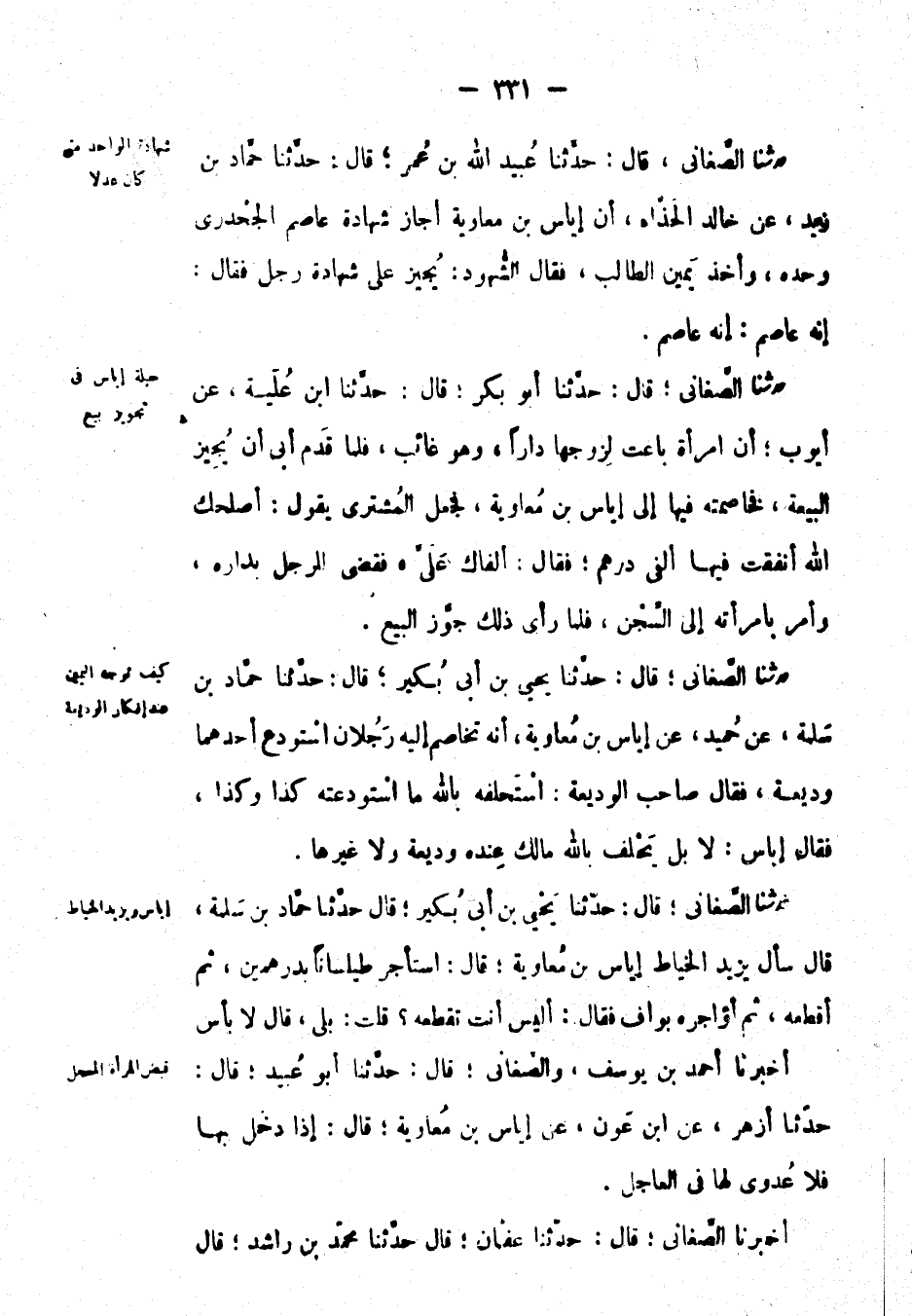 حَدَّثَنَا الصغاني، قال: حَدَّثَنَا عبيد الله بْن عُمَر؛ قال: حَدَّثَنَا حماد بْن زيد، عَن خالد الحذاء، أن إياس بْن معاوية أجاز شهادة عاصم الجحدري وحده، وأخذ يمين الطالب، فَقَالَ: الشهود: يجيز على شهادة رجل فقال: إنه عاصم: إنه عاصم.