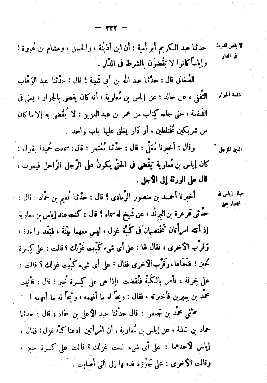 الصغاني قال: حَدَّثَنَا عَبْدُ اللهِ بْن أبي شيبة؛ قال: حَدَّثَنَا عَبْدُ الوهاب الثقفي، عَن خالد؛ عَن إياس بْن معاوية، أنه كان يقضي بالجوار، يعني في الشفعة، حتى جاءه كتاب من عُمَر بْن عَبْد العزيز: لا يقضي به إِلَّا ما كان من شريكين مختلطين، أو دار يغلق عليها باب واحد.