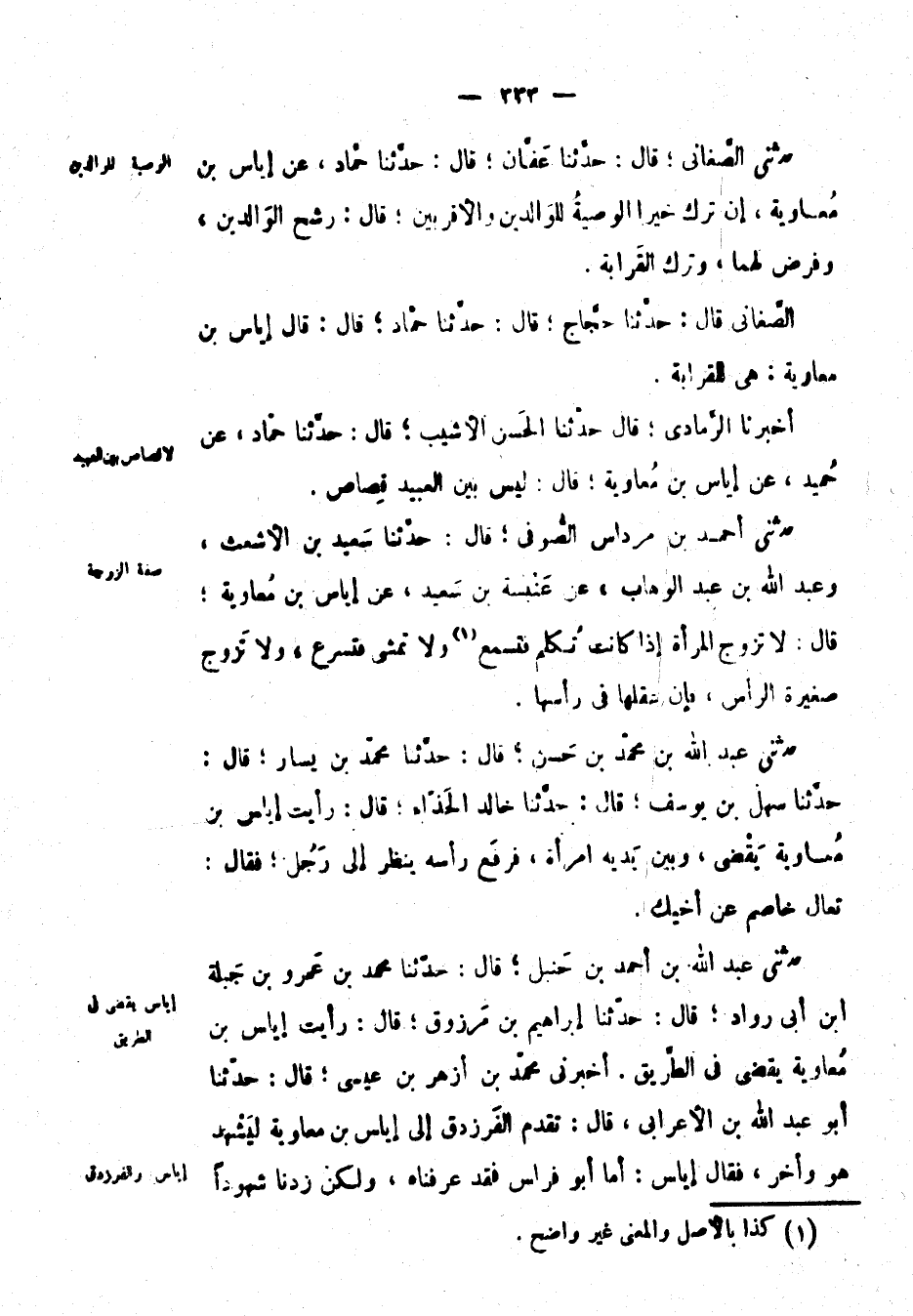 حَدَّثَنِي أَحْمَد بْن مرداس الصوفي؛ قال: حَدَّثَنَا سعيد بْن الأشعث، وعَبْد اللهِ بْن عَبْد الوهاب، عَن عنبسة بْن سعيد، عَن إياس بْن معاوية؛ قال: لا تزوج المرأة إِذَا كانت تكلم فتسمع ولا تمشي فتسرع، ولا تزوج صغيرة الرأس، فإن عقلها في رأسها.