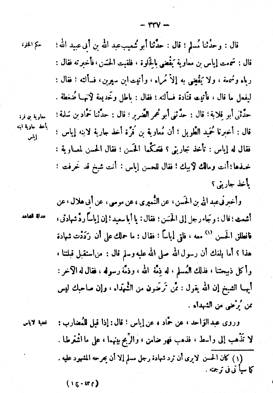 وأَخْبَرَنِي عَبْد اللهِ بْن الْحَسَن، عَن النميري، عَن موسى، عَن أبي هلال، عَن أشعث؛ قال: وجاء رجل إِلَى الْحَسَن؛ فقال: يا أبا سعيد؛ إن إياساً رد شهادتي، فانطلق الْحَسَن معه، فلقي إياساً؛ فقال: ما حملك على أن رددت شهادة هَذَا ? أما بلغك أَنَّ رَسُوْلَ اللهِ صَلَّى اللَّهُ عَلَيْهِ وَسَلَّمَ قال: من استقبل قبلتنا، وأكل ذبيحتنا، فذلك المسلم، له ذمة الله، وذمة رسوله، فَقَالَ لَهُ الآخر: أيها الشيخ إن الله يقول: مِمَّن تَرْضَوْنَ مِنَ الشُّهَدَاء [البقرة: 282] وإن صاحبك ليس ممن يرضى من الشهداء.