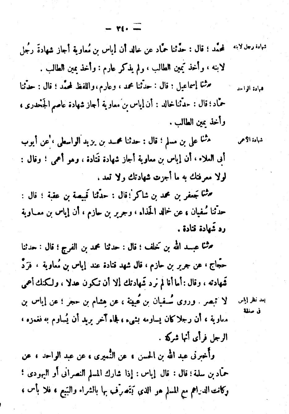 حَدَّثَنَا إسماعيل؛ قال: حَدَّثَنَا مُحَمَّد، وعارم، واللفظ لمُحَمَّد؛ قال: حَدَّثَنَا حماد؛ قال: حَدَّثَنَا خالد: أن إياس بْن معاوية أجاز شهادة عاصم الجحدري، وأخذ يمين الطالب.