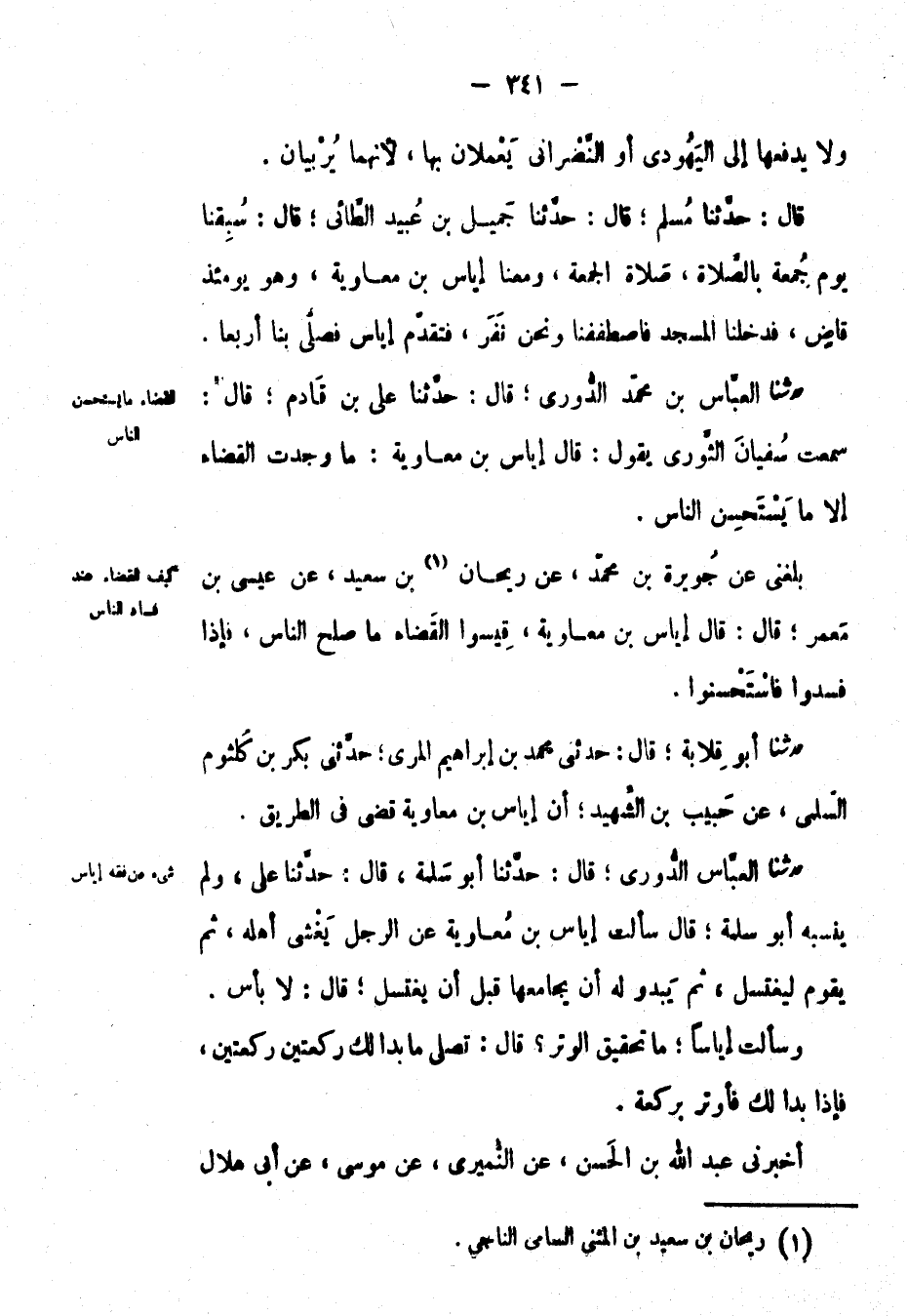 حَدَّثَنَا أَبُو قلابة؛ قال: حَدَّثَنِي مُحَمَّد بْن إبراهيم المري؛ حَدَّثَنِي بكر بْن كلثوم السلمي، عَن حبيب بْن الشهيد؛ أن إياس بْن معاوية قضى في الطريق.