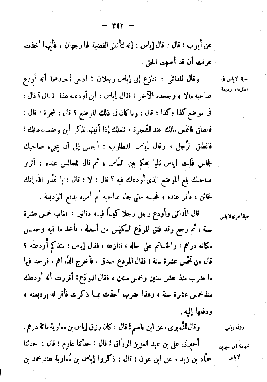 وقَالَ: المدائني: تنازع إِلَى إياس رجلان؛ ادعى أحدهما أنه أودع صاحبه مالاً، وجحده الآخر؛ فَقَالَ: إياس: أين أودعته هَذَا المال ? قال: في موضع كذا وكذا؛ قال: وما كان في ذلك الموضع? قال: شجرة؛ قال: فانطلق فالتمس مالك عند الشجرة، فلعلك إِذَا أتيتها تذكر أين وضعت مالك؛ فانطلق الرجل، وقَالَ: إياس للمطلوب: اجلس إِلَى أن يجئ صاحبك فجلس فلبث إياس ملياً يحكم بين الناس، ثم قَالَ: للجالس عنده: أترى صاحبك بلغ الموضع الذي أودعك فِيْهِ ? قال: لا؛ قال: يا عدو الله إنك لخائن، فأقر عنده، فحبسه حتى جاء صاحبه ثم أمره بدفع الوديعة.