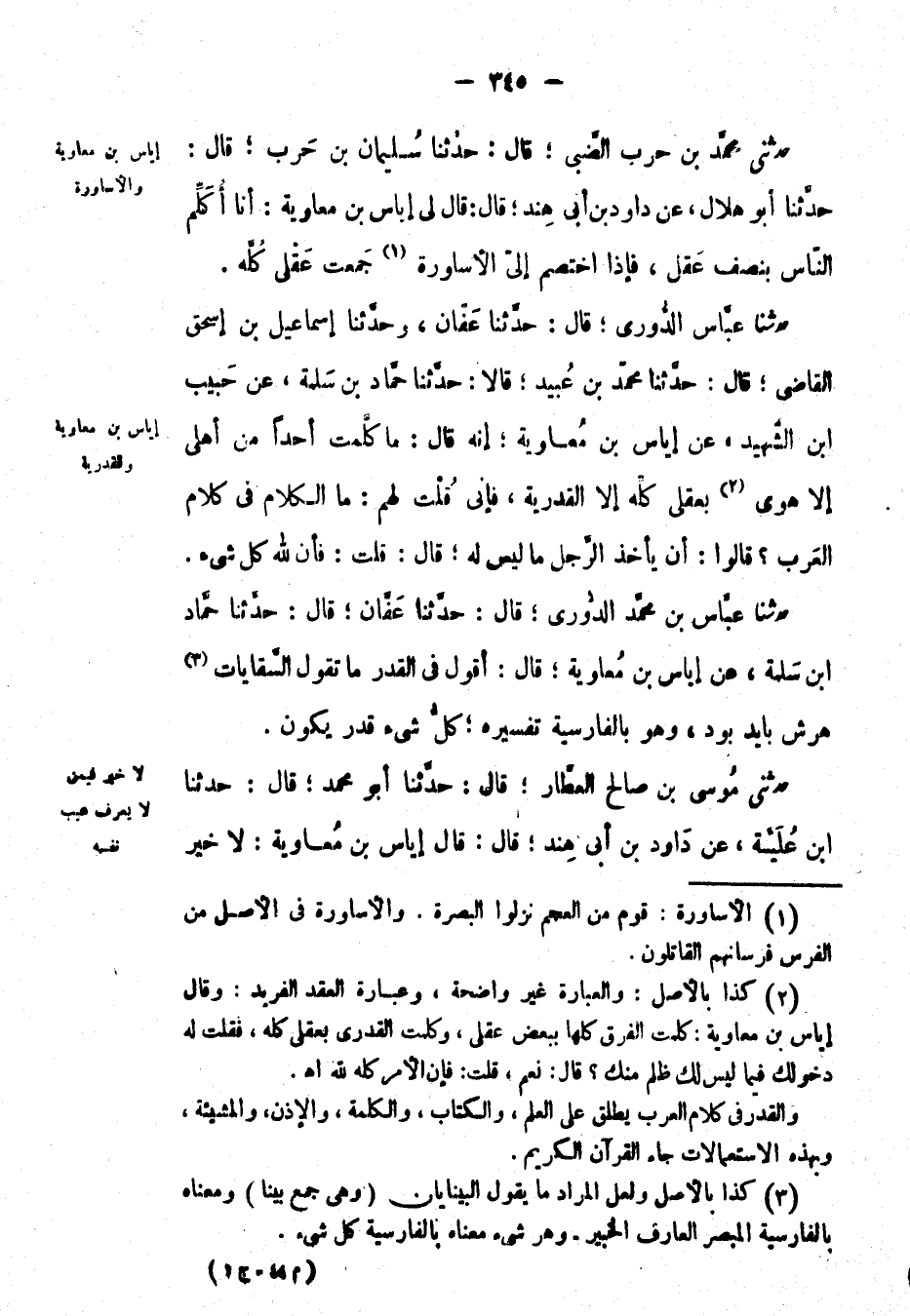 حَدَّثَنَا عباس الدوري؛ قال: حَدَّثَنَا عفان، وَحَدَّثَنَا إسماعيل بْن إسحاق القاضي؛ قال: حَدَّثَنَا مُحَمَّد بْن عبيد؛ قالا: حَدَّثَنَا حماد بْن سلمة، عَن حبيب ابن الشهيد، عَن إياس بْن معاوية؛ إنه قال: ما كلمت أحداً من أهلي إِلَّا هوى بعقلي كله إِلَّا القدرية، فإني قلت لهم: ما الكلام في كلام العرب ? قالوا: أن يأخذ الرجل ما ليس له؛ قال: قلت: فأن لله كل شيء.
