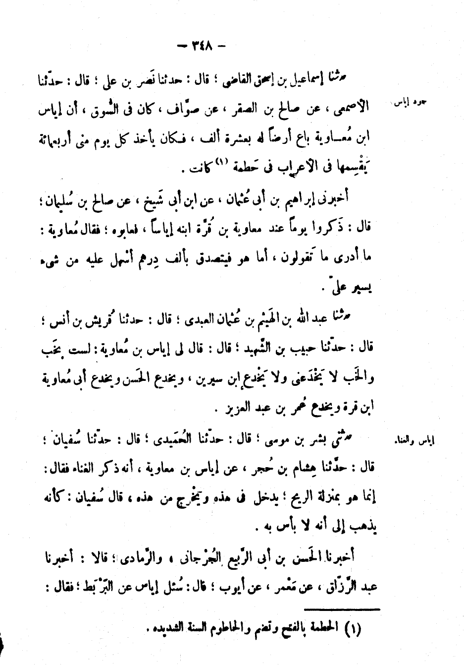 حَدَّثَنَا إسماعيل بْن إسحاق القاضي؛ قال: حَدَّثَنَا نصر بْن علي؛ قال: حَدَّثَنَا الأصمعي، عَن صالح بْن الصقر، عَن صواف، كان في السوق، أن إياس ابن معاوية باع أرضاً له بعشرة ألف، فكان يأخذ كل يوم مني أربعمائة يقسمها في الأعراب في حطمة كانت.